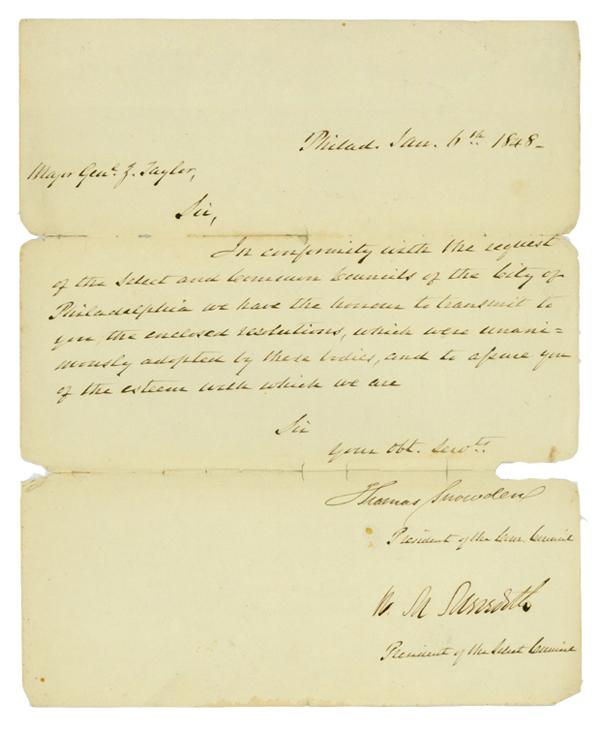 [Zachary Taylor] 1848. Philadelphia. 4 pp. ALS to Taylor by future Treasury Secretary William Meredith; “Philad. Jan 6, 1848 - Genl Z. Taylor Sir, In conformity with the request of the select and Common Councils of the City of Philadelphia we have the honour to transmit to you the enclosed resolutions, which were unanimously adopted by these bodies, and to assure you of the esteem with which we are. Sir, Your obt Servts, Thomas Snowden President of the Com. Council, W. M. Meredith.” William Morris Meredith. (1799–1873) American lawyer, He served in the Pennsylvania State Legislature from 1824 to 1828, and was president of the Philadelphia City Council from 1834 until 1849. He was also United States Attorney for the Eastern District of Pennsylvania in 1841. President Zachary Taylor, wanting a Pennsylvanian Whig for his cabinet, appointed Meredith to be the 19th Secretary of the Treasury. He began his term in office in March 1849 In this letter, Meredith is referring to one of the many resolutions passed throughout the grateful nation bestowing honors upon Taylor and his forces for gallant service during the Mexican-American War. Fold marks with 1” x ¼” chink along bottom right crease, just above Snowden’s autograph; light chipping to left corner folds, and light minor wear. A fine letter bearing the signatures of both Thomas Snowden and William Meredith. One year after this letter was written, the newly elected President Taylor would elevate Meredith to high office in his cabinet.