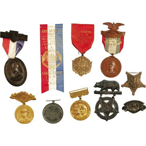 <B>G.A.R. Medal Group</B></I> A good set of eleven (11) medals and ribbons worn by Civil War veterans at various encampments and meetings of the Grand Army of the Republic. A good variety from various localities including San Francisco, Grand Rapids, and Kalamazoo, Michigan, New Castle, Indiana, Lancaster, Ohio, and others. Ribbons bear some fraying, medals overall good with some tarnishing, else very good. Together, eleven pieces.<BR><BR><b>Shipping:</b> Miscellaneous Collectibles, Smal (<a target="_blank" href="http://www.heritageauctions.com/common/shipping.php">view shipping information</a>) <BR><BR><B>Important notice:</