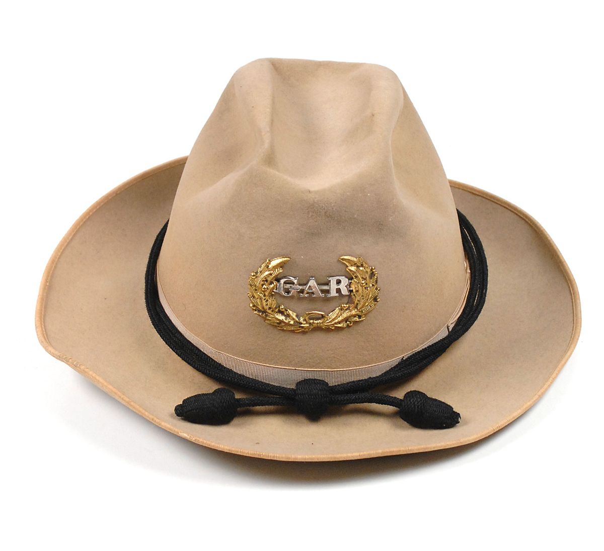 Original beige G.A.R. slouch hat by Knox hatmakers of New York. No size label is visible but hat measures almost 22.5? in diameter. Hat retains the leather sweat band, as well as the original Knox manufacturer’s label inside. Hat has a beige band and a replacement black braided cord. Front of the hat bears a stamped brass GAR wreath. In overall fine condition. Accompanied by a tintype of Thomas P. Jarvis of the 9th West Virginia Infantry, although it is unknown for certain if this hat was his. However the hat and tintype were both purchased at an estate sale of Jarvis’s descendants.
