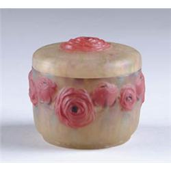 Lot 638 G. ARGY ROUSSEAU BOX Rose decorated. Signed “G. Argy Rousseau”. SIZE: 3” t. CONDITION: Good with minor roughness to rim of box and bottom. 5-70608