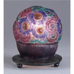 Lot 626 G. ARGY ROUSSEAU LAMP Rare Veilleusy La Coupe Fleurie accent lamp. Beautiful amethyst, teal, and blue floral pattern over all. Shade appears to sit on original base. Signed “G. Argy Rousseau”.  SIZE: 5” t.  CONDITION: Shade is very good, minor restoration to one ball foot underneath. 5-70586