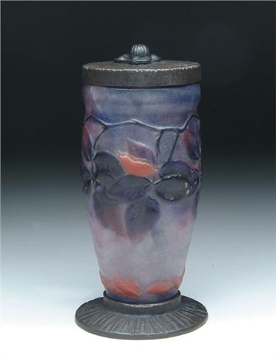 G. ARGY ROUSSEAU NITE LITE. Pretty pate de verre nite lite has band of rose, stems and leaves with red rose petals surrounding the shoulder of the nite lite. A band of red individual rose petals surrounds the foot. Nite lite sets in tooled iron base with matching cap. SIZE: 7 in. t. CONDITION: Glass has two tight cracks approx. 3 in. l extending from top downward. 5-61063