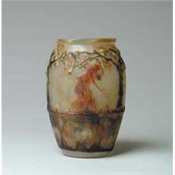 Lot 1034 G. ARGY ROUSSEAU PATE DE VERRE VASE. Beautiful Pate de Verre vase depicts women picking apples from trees atop a stylized stone wall. Signed on side "G. Argy-Rousseau". SIZE: 9-1/2" t. CONDITION: Very good to excellent. 5-70153 (6,000-8,000)