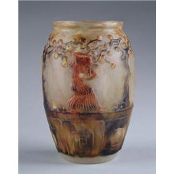 Lot 627 G. ARGY ROUSSEAU PATE DE VERRE VASE Beautiful Pate de Verre vase depicts women picking apples from trees atop a stylized stone wall. Signed on side "G. Argy-Rousseau". SIZE: 9-1/2" t. CONDITION: Very good to excellent. 5-70153