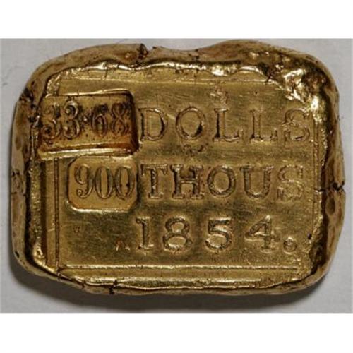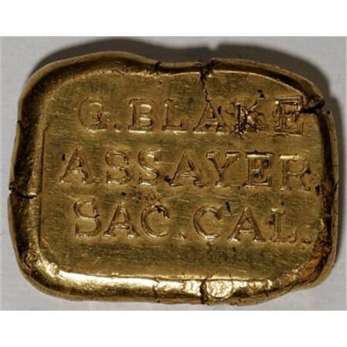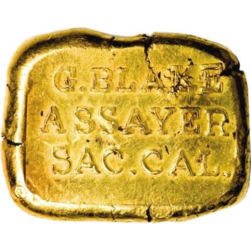 <B>G. Blake Gold Ingot. 57.3 grams.</B></I><BR> Gorham Blake is best known as the manufacturer of some of the ingots recovered from the <I>S.S. Central America.</B></I> This appears to be a fantasy piece that dates from the 1950s. The top side reads: G. BLAKE / ASSAYER / SAC. CAL. The back reads: 33.68 DOLLS / 900 THOUS /1854. Measures: 23 x 30 mm. <BR><BR><b>Shipping:</b> Coins & Currency (<a target="_blank" href="http://www.heritageauctions.com/common/shipping.php">view shipping information</a>)