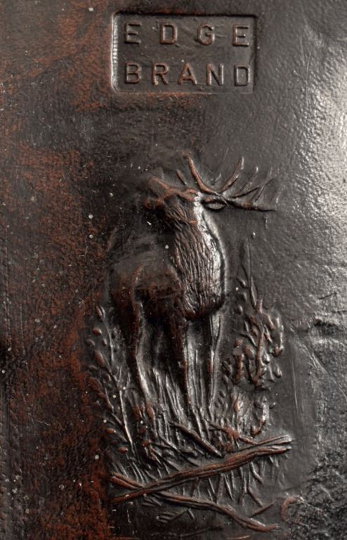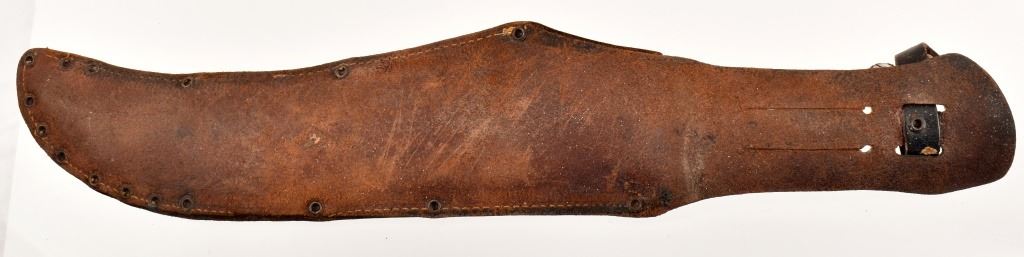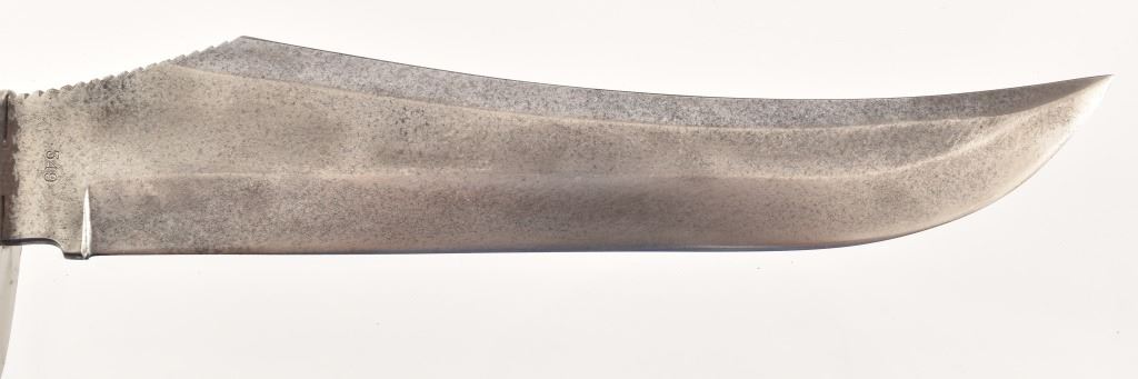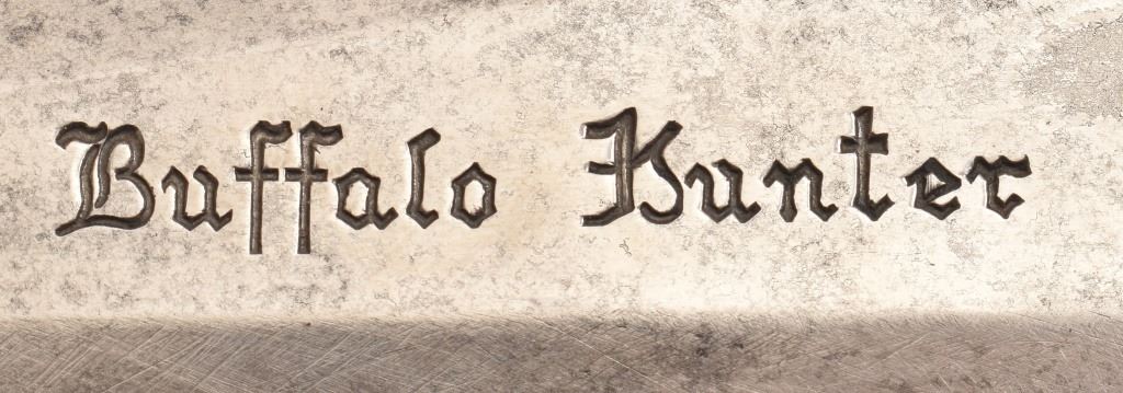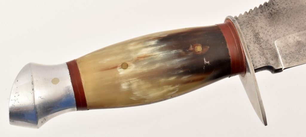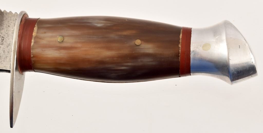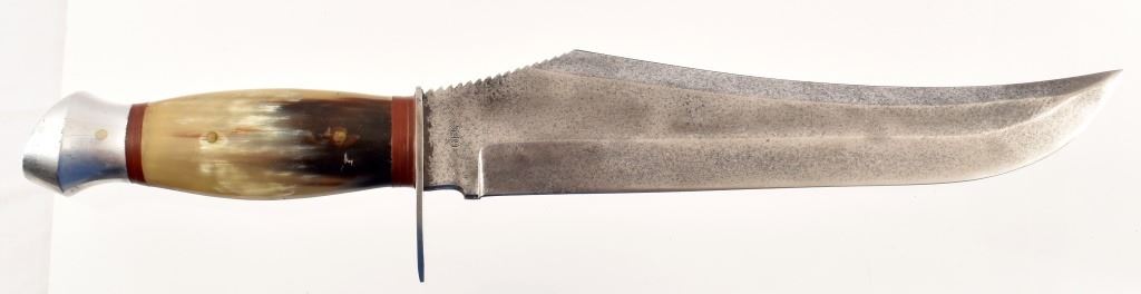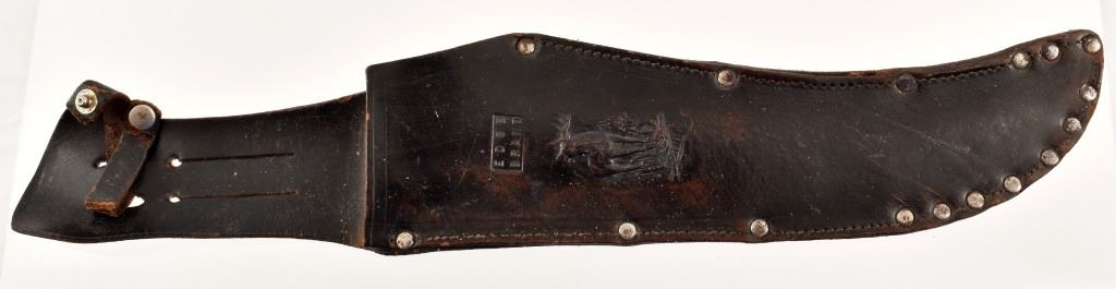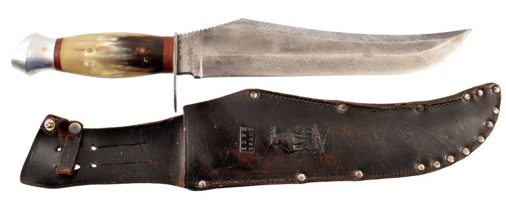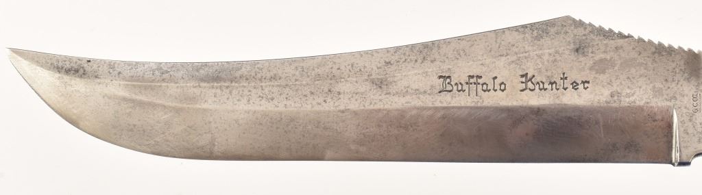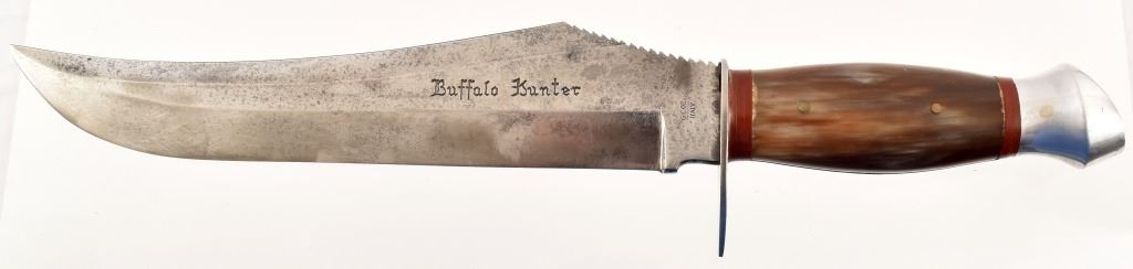 10" blade stamped "G.C.Co. Italy" along with "Buffalo Hunter", and "349" on the other side. Horn handle. 15" overall length. Edge Mark Leather sheath embossed with bugling elk scene.