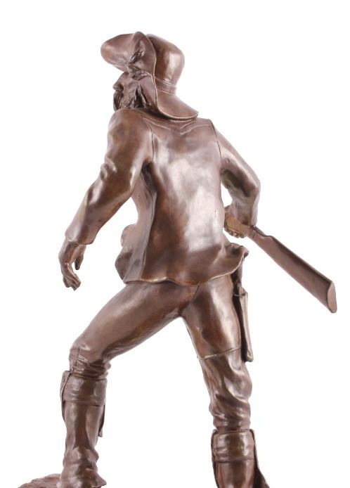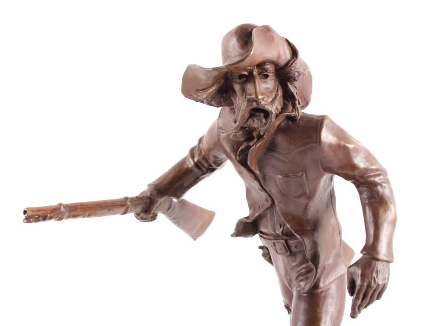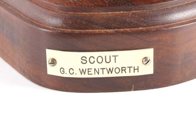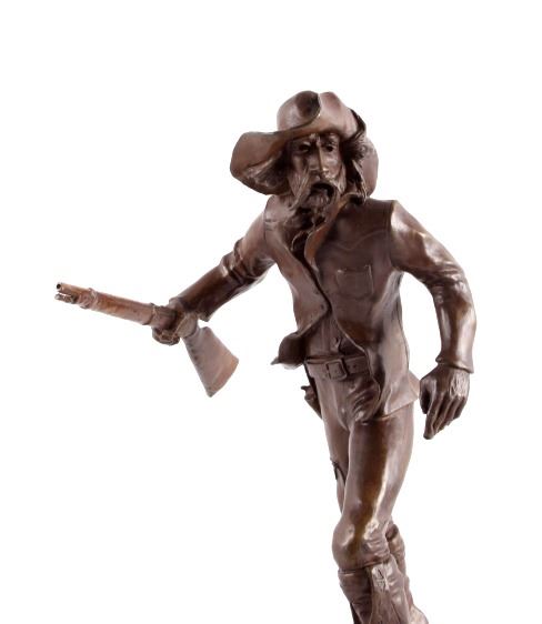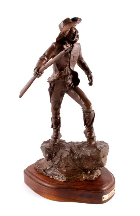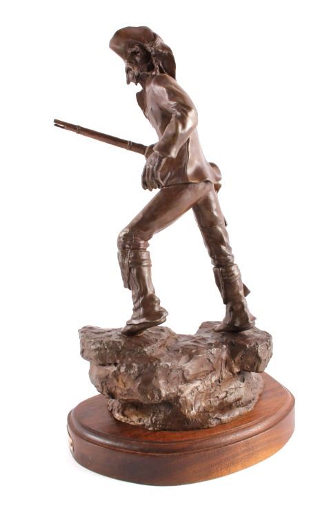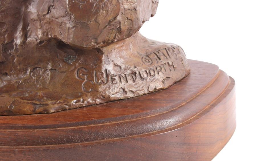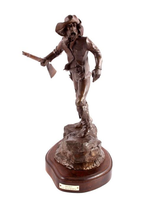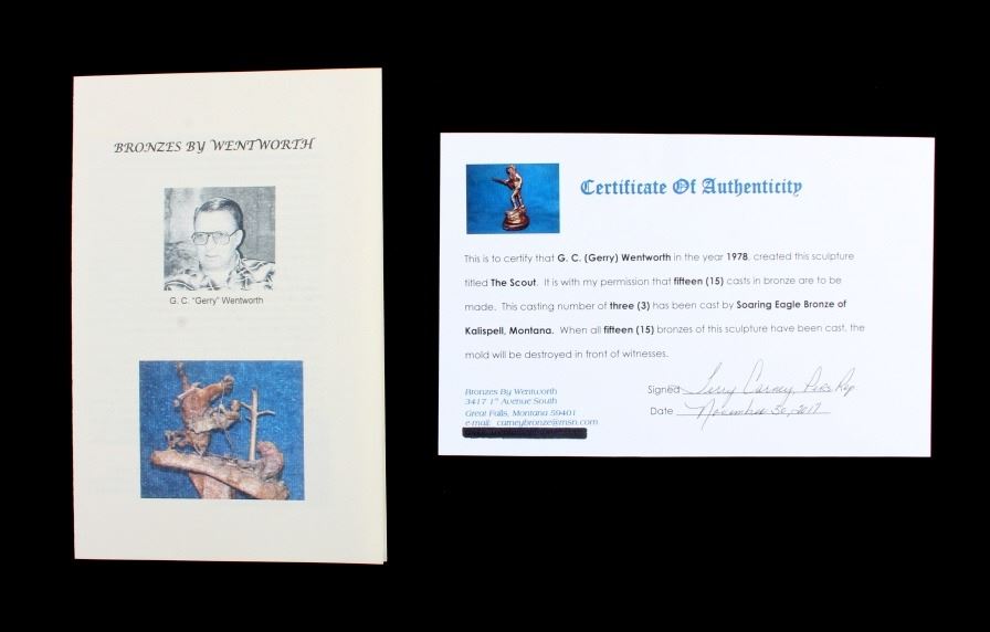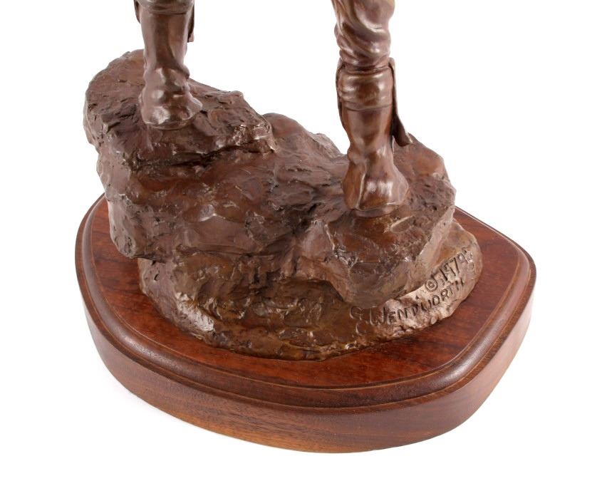 This is an original G.C. (Gerry) Wentworth bronze sculpture titled "The Scout". Gerry Wentworth was a Great Falls, Montana artist who grew up in the era just after Charles Russell's life. He was largely self taught and spent the majority of his life working in painting, sculpture and wood carving. Wentworth's works have been widely exhibited in such places as the C.M. Russell Show, the Phippen Art Show and the Frank Tenney Johnson Show. In 1981, he won Best of Show at the Northwest Americana Art Show. This sculpture shows the frontier scout in pursuit on foot. The piece shows wonderful detail and action. The bronze sits on a solid walnut hardwood base with a brass placard that reads "Scout G.C. Wentworth". The bronze is signed by the artist. It is dated "1978" and is numbered 3/15. The piece shows very good condition. It measures 7.5" x 10" and is 16.5" tall. The bronze originally sold in the gallery for $2,000.