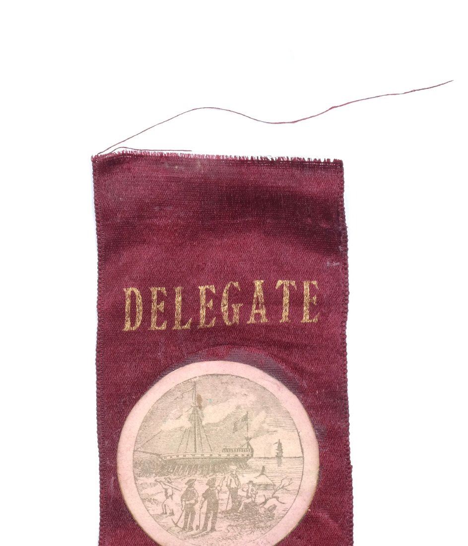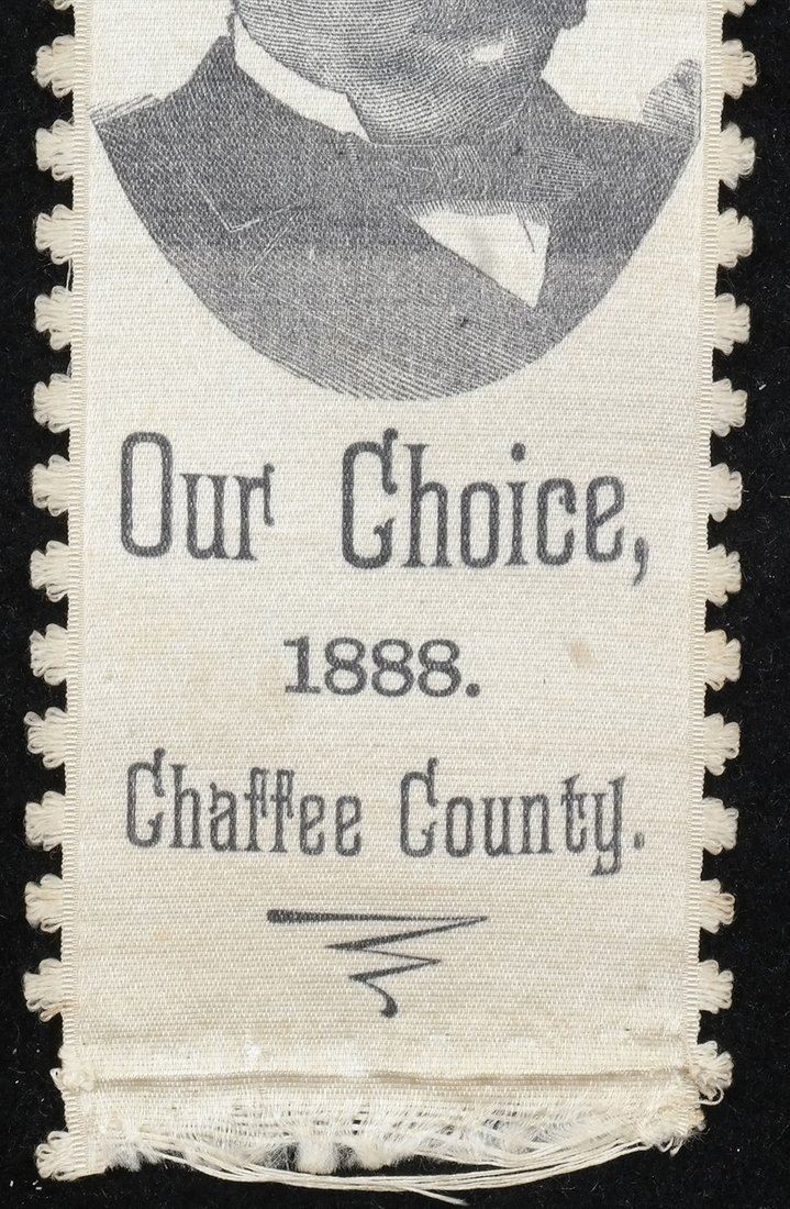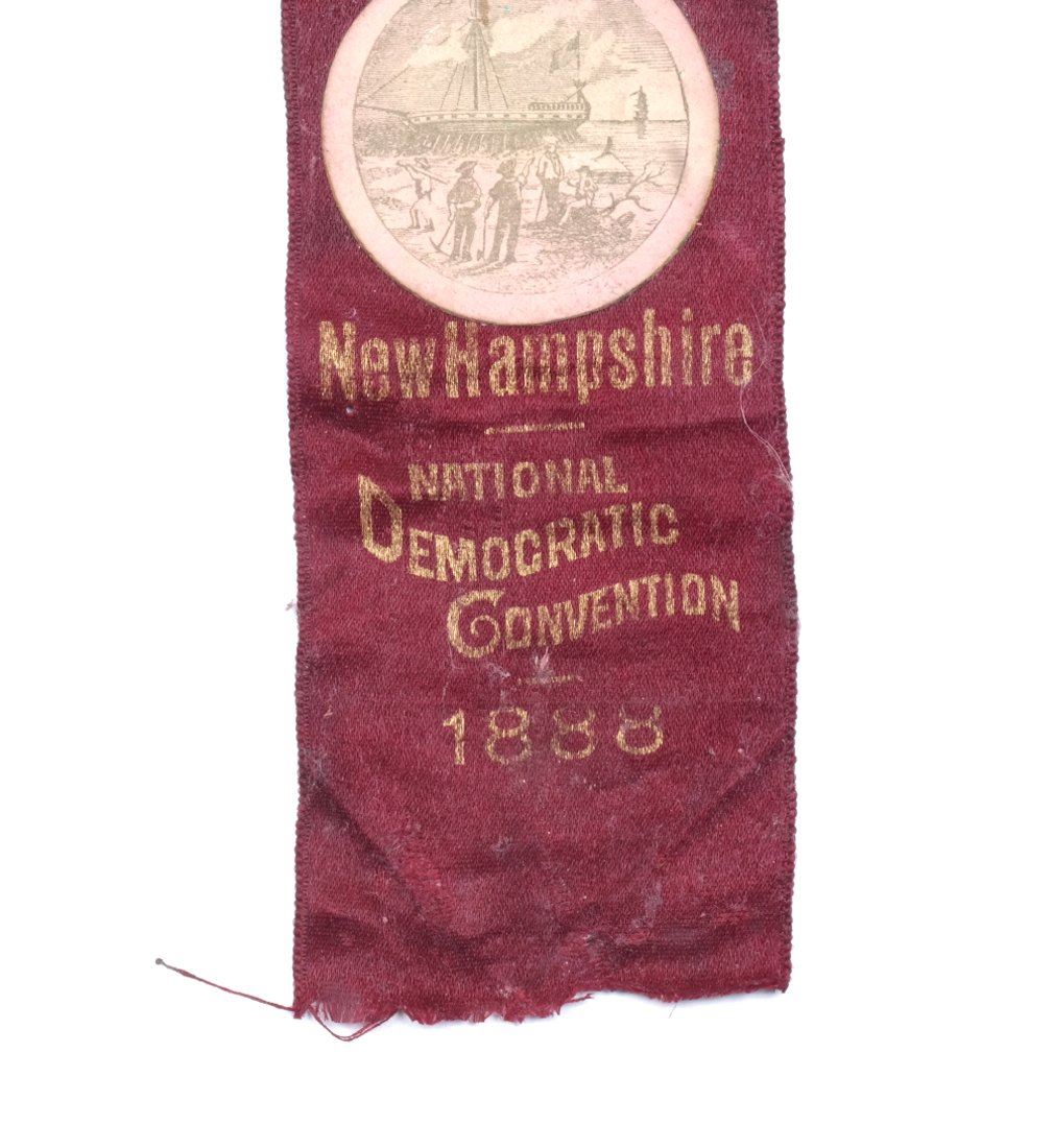 Three satin ribbons comprising: 1.) Maroon ribbon with applied circular card stock medallion bearing an engraving vignette of a U.S. warship and laborers. Bears gilt-stamped text "Delegate / New Hampshire / National Democratic Convention / 1888." 2.) Off-white ribbon with bust length, 3/4 profile, portrait of Cleveland above text "Our Choice, / 1888 / Chaffee County." 3.) Vivid off-white ribbon printed in red, blue, black, and green. Features opposed jugate portraits with U.S. flag above and federal eagle.