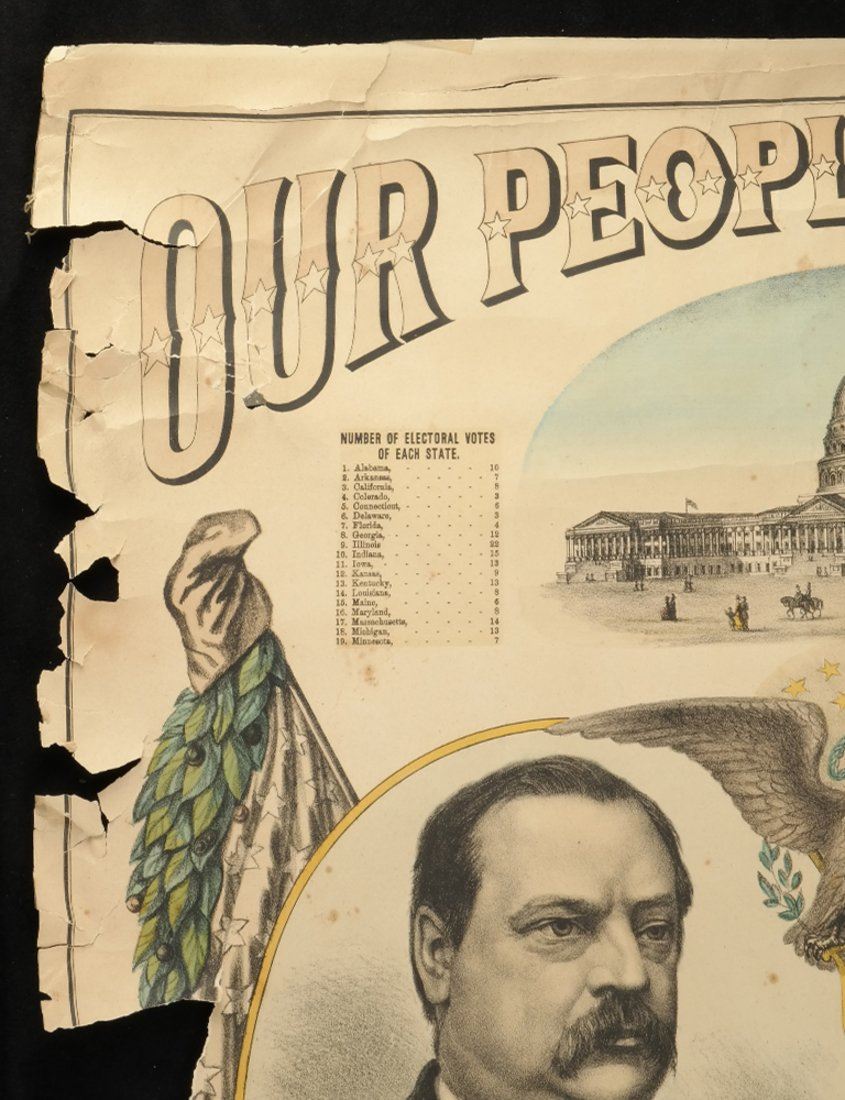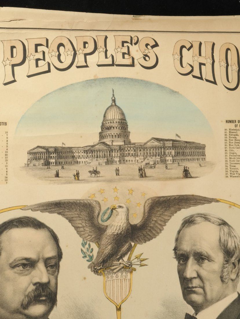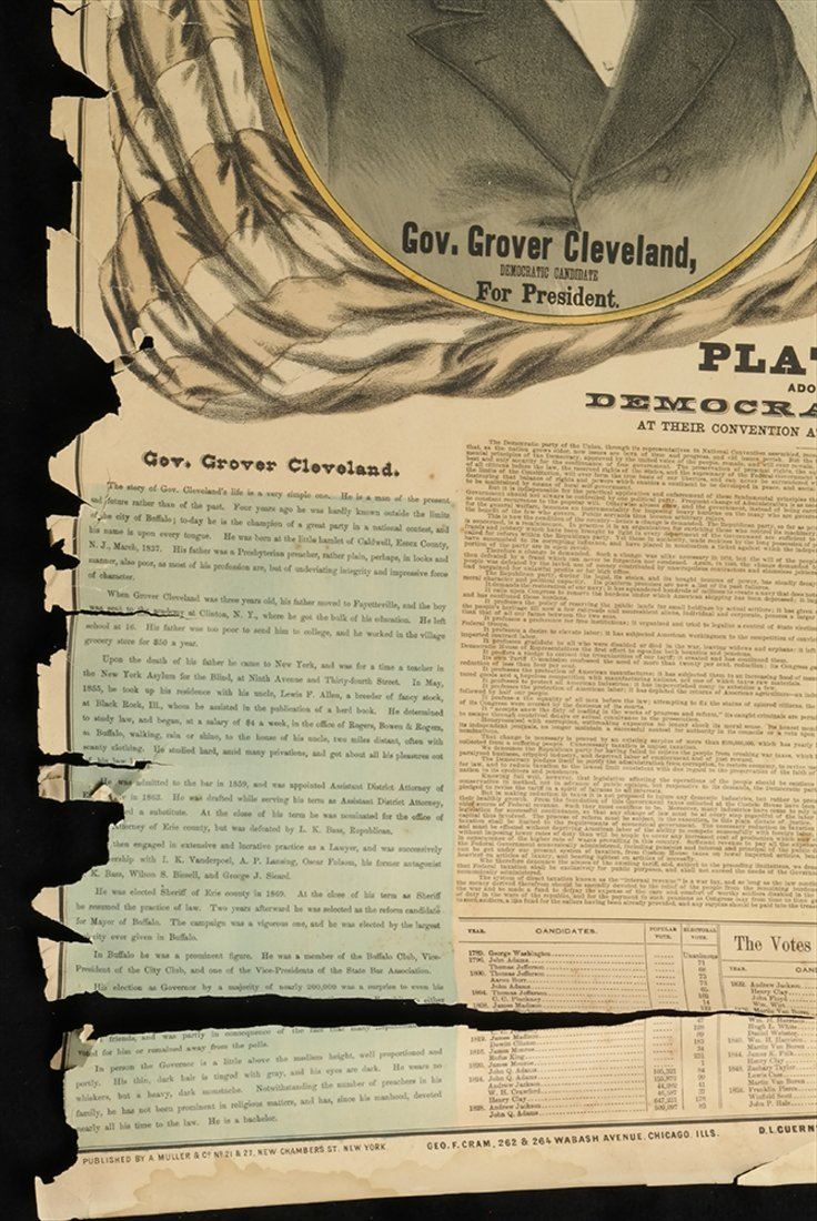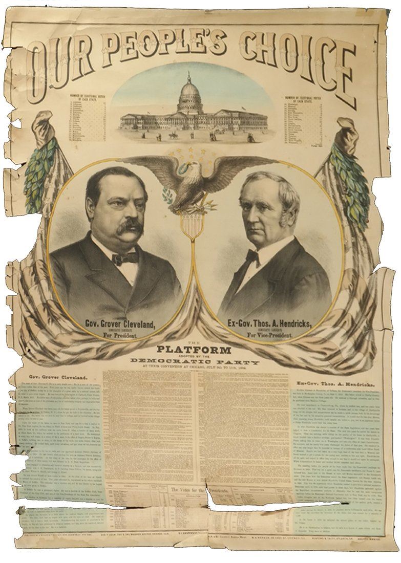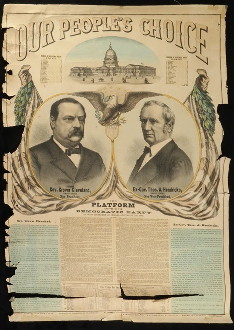Large color campaign poster boldly headed "Our People's Choice." Features jugate portraits of the candidates in bust length, 3/4 profile, poses. Bears lengthy biographies of both Cleveland and Hendricks flanking the Democratic Party platform adopted at the July 1884 Chicago, IL. convention. Ornament includes the federal eagle and shield, U.S. Flags with liberty caps, and a vignette of the Capitol Building at top. Published by A. Muller & Co., New York, NY. Accompanied by a folio broadside boldly printed at top "Cleveland/ Thurman and Hill!" relating: "Honorable Staley N. Wood...Will Address the people of Hume...on the political issues of the day, Wednesday Evening October 10 at the Rink in Hume Village." Printed by The Hume Enterprise Print, Hume, IL., circa 1884.