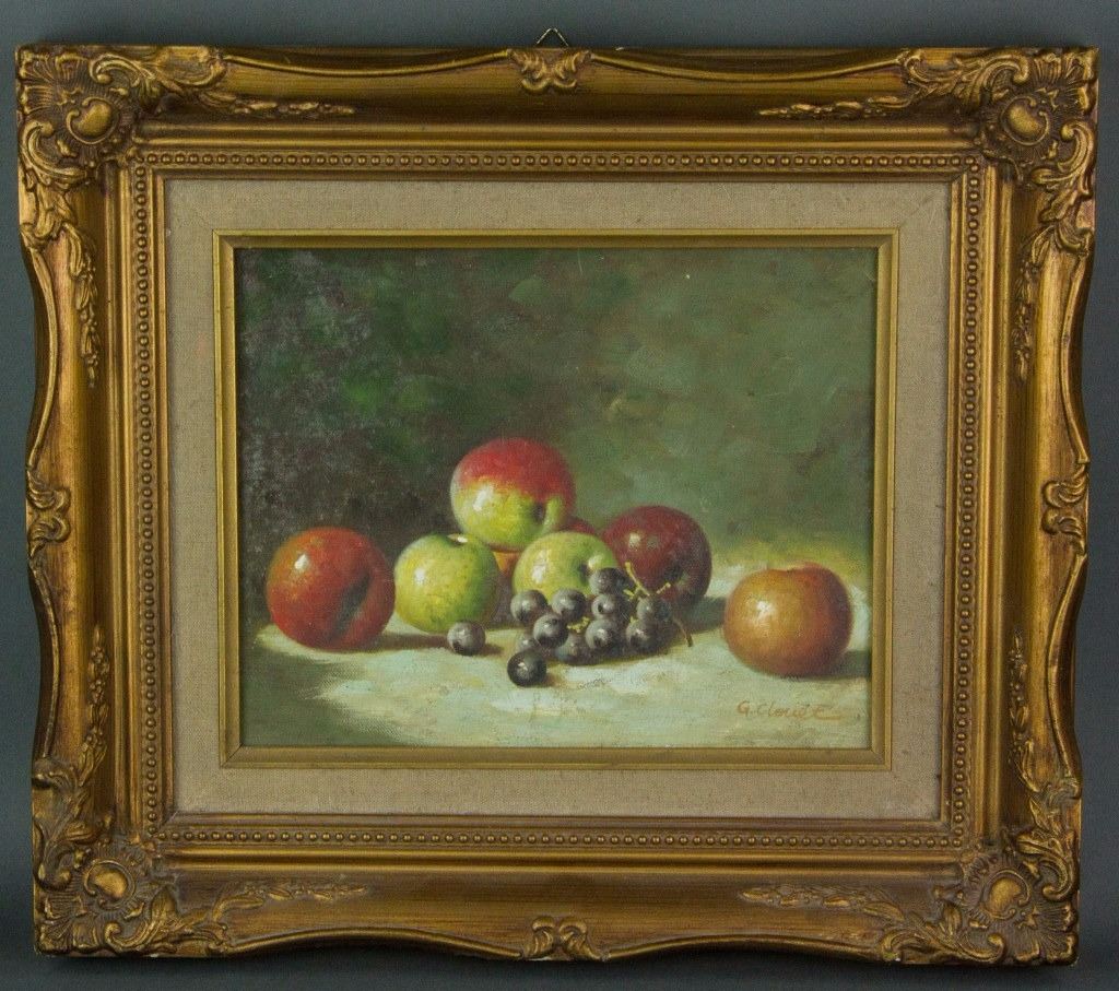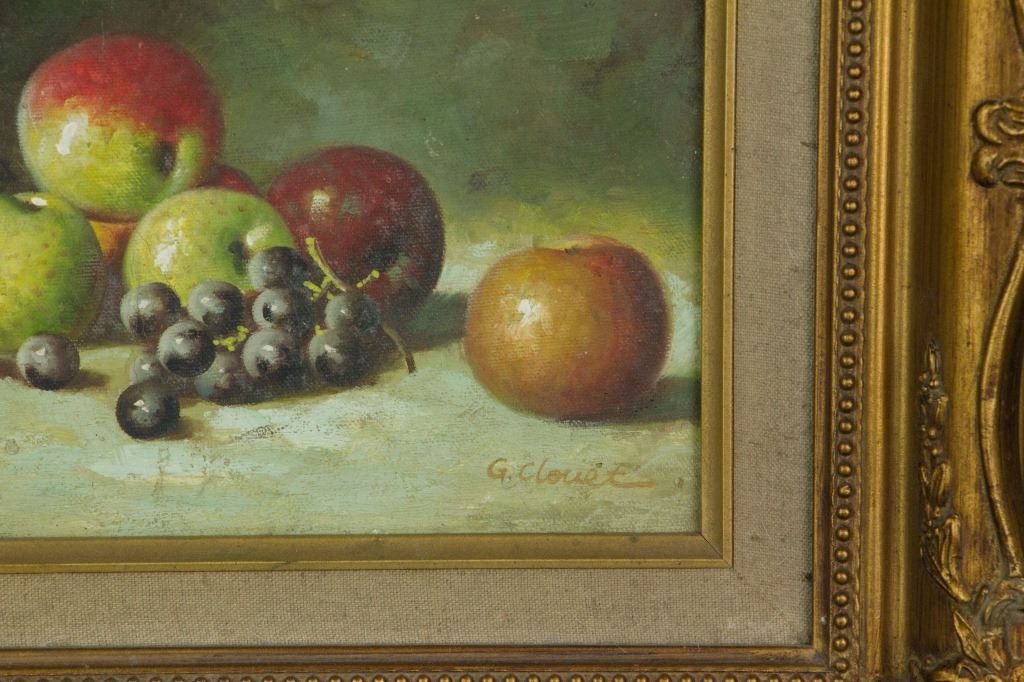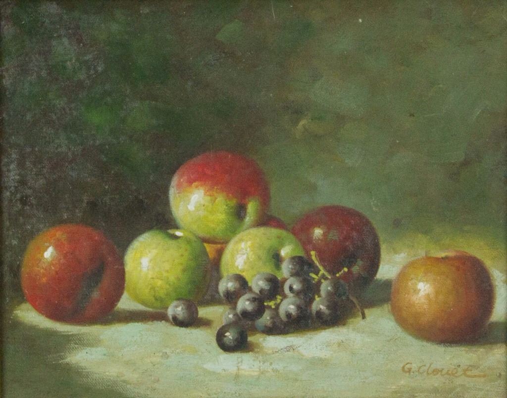 Still life painting of fruits; oil on canvas, glued to panel; framed; signed G Clouet; 19 cm × 24 cm