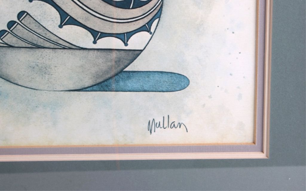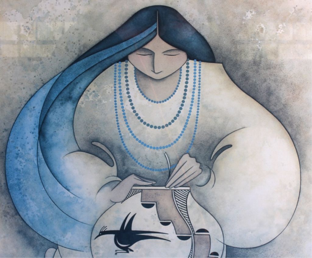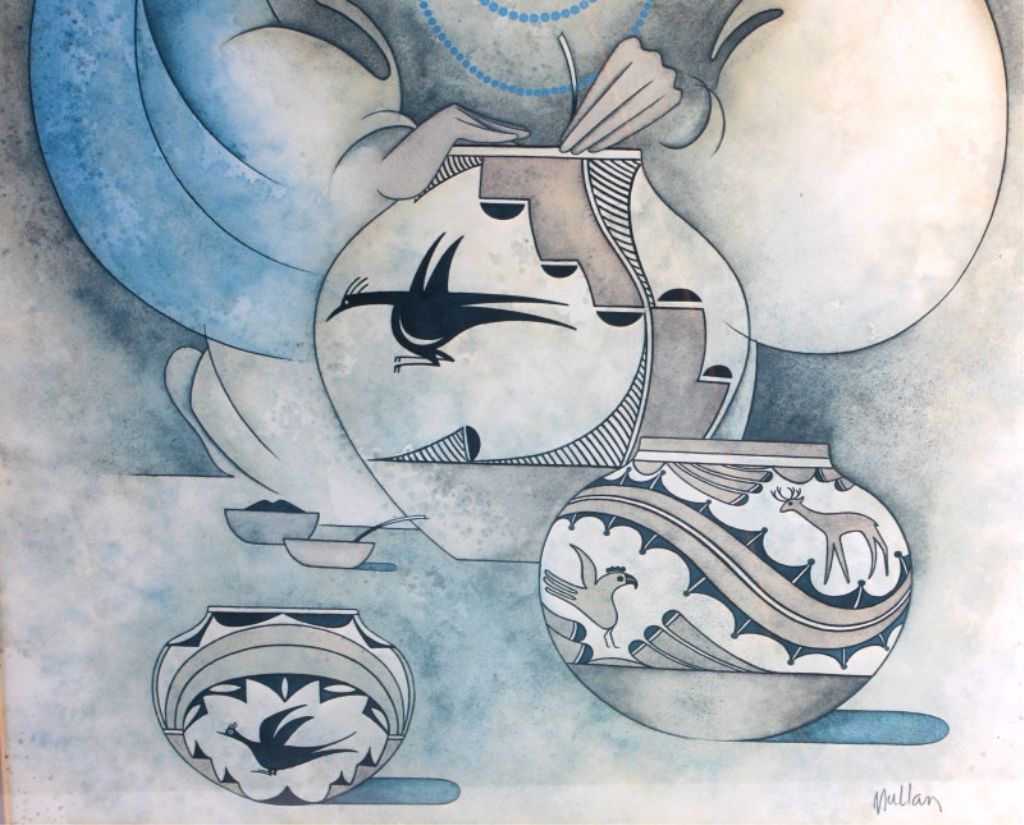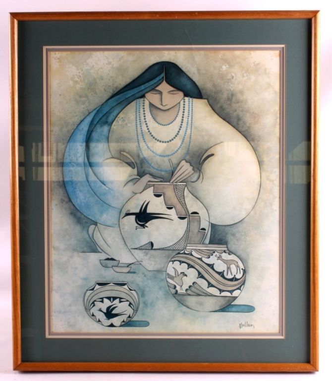 This is a G.E. Mullan framed print. The print depicts a Navajo potter creating a vase. The print is in very good condition. It has been professionally matted and framed. The frame measures 23.5" x 28".
