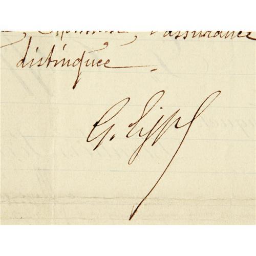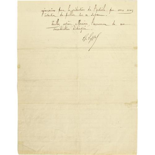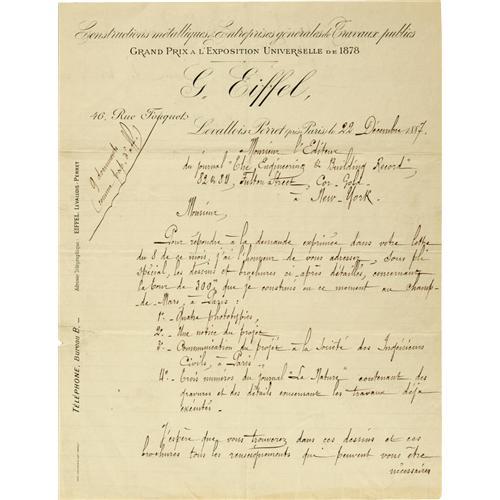 <B>Gustave Eiffel Autograph Letter Signed Transmitting His Designs and Blueprints for the Eiffel Tower.</B></I> ALS <I>"G Eiffel"</B></I> in French on his personalized Grand Prix a l'Exposition Universelle de 1878 letterhead, 2pp., 8.5" x 10.5", Paris, Dec. 22, 1887 to an editor of the New York publication <I>The Engineering & Building Record</B></I> submitting various documents regarding construction of the Eiffel Tower. He writes, in part: <I>"I am sending you the designs and blueprints and other details concerning the tower of 300 m eters that I am constructing at this time at the Champ-de-Mars Paris. 1) Four phototypes 2) a notice of the project 3) a communication of the project to the Civil Engineers Society of Paris 4) Various thoughts of the journal of 'La Nature' containing pictures and details concerning the work already executed. I hope that you will find in these designs all the requirements that may be necessary to you for the editing of the article which you intend to publish on this subject." </B></I> <BR><BR>Ironically, the publication had just published an article on the use of elevators in the Eiffel Tower the previous month, in November. One wonders if there was a delay in correspondence such that the materials requested were not sent until after the originally intended article, or if there was such an overwhelming response that they considered doing a follow-up. The Eiffel Tower would become the world's tallest structure upon its completion for the 1889 International Exhibition in Paris, and the use of elevators would revolutionize the possibility of building taller structures. The Eiffel Tower replaced the Washington Monument as the world's tallest man-made structure; a title it would retain until 1930 when the Chrysler Building was completed. <BR><BR>The letter is accompanied by a contemporary translation written in pencil on a sheet of <I>The Engineering & Building Record</B></I> letterhead. Both items are housed in a green full Moroccan leather case. The Eiffel letter has the usual folds with two tiny tears that have been archivally repaired on verso and well away from Eiffel's script.<BR><BR><b>Shipping:</b> Small Collectibles (<a target="_blank" href="http://www.heritageauctions.com/common/shipping.php">view shipping information</a>)