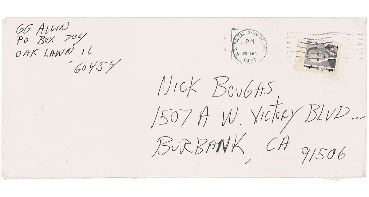 American punk rock singer-songwriter (1956–1993) whose obscene live shows, varied musical influences, and public self-destruction made him an unprecedented cult legend. Hand-addressed mailing envelope, 9.5 x 4, addressed to “Nick Bougas, 1507 A. W. Victory Blvd., Burbank, CA 91506,” and incorporating his name in the return address, “GG Allin, PO Box 704, Oak Lawn IL, 60454.” Postmarked August 26, 1991. In fine condition. Accompanied by a handbill advertising screenings of Hated: GG Allin and the Murder Junkies.