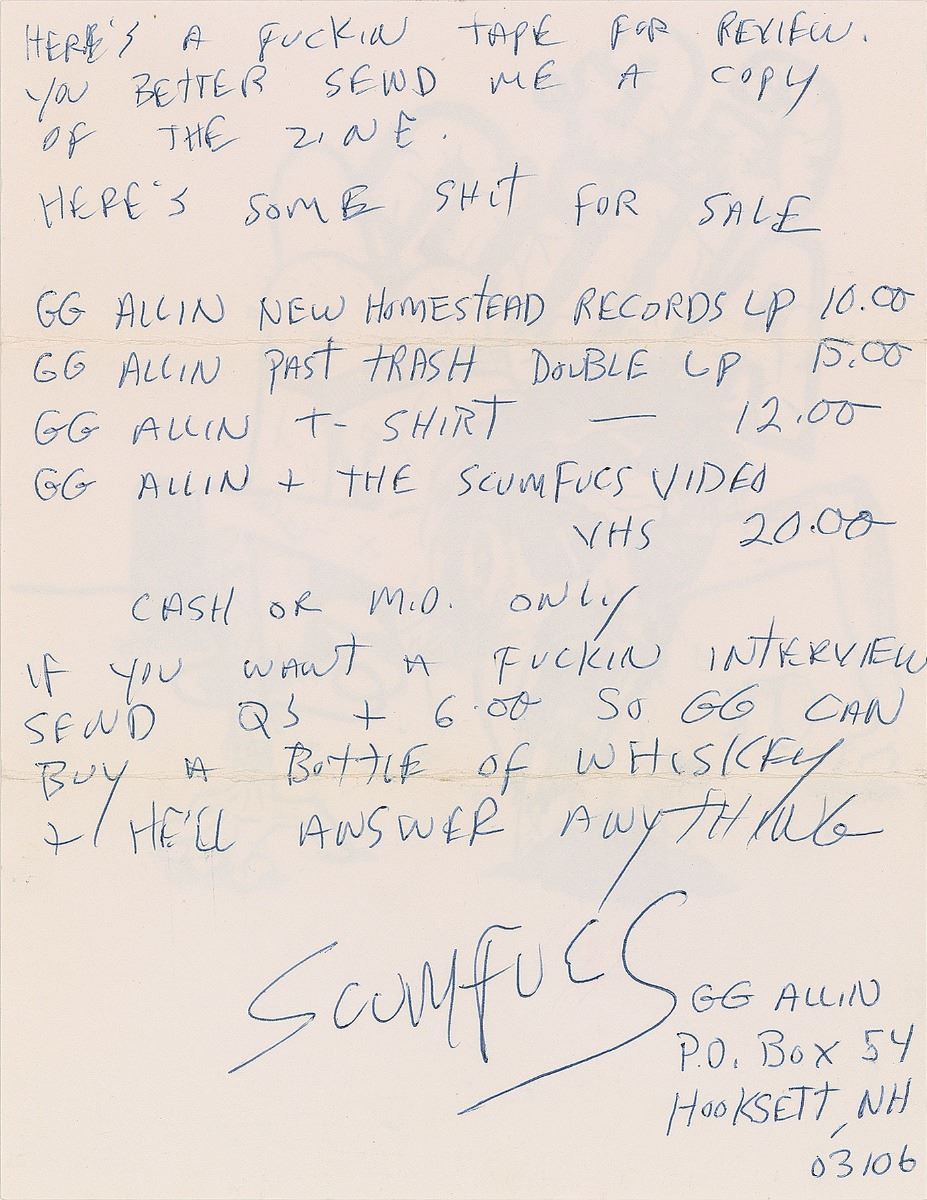 American punk rock singer-songwriter (1956–1993) whose obscene live shows, varied musical influences, and public self-destruction made him an unprecedented cult legend. Third person ALS, signed twice within the text and lower address field, “GG” and “GG Allin,” one page on the reverse of an obscene 8.5 x 11 illustrated promo, no date but postmarked 1987. Letter to Jeff Shirilla from Tales from the Pit, in full: “Here’s a fuckin tape for review. You better send me a copy of the zine. Here’s some shit for sale. GG Allin New Homestead Records LP 10.00. GG Allin Past Trash Double LP 15.00. GG Allin T–Shirt—12.00. GG Allin & the Scumfucs Video, VHS 20.00. Cash or M.O. only. If you want a fuckin interview send Qs & 6.00 so GG can buy a bottle of whiskey & he’ll answer anything. Scumfucs.” In fine condition. Accompanied by the original mailing envelope, addressed in Allin’s own hand and signed again in the address field.