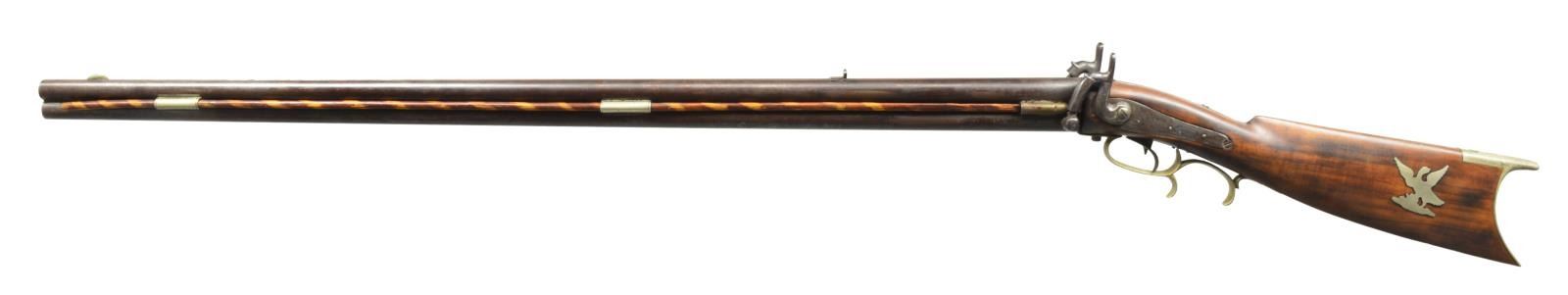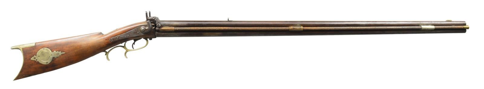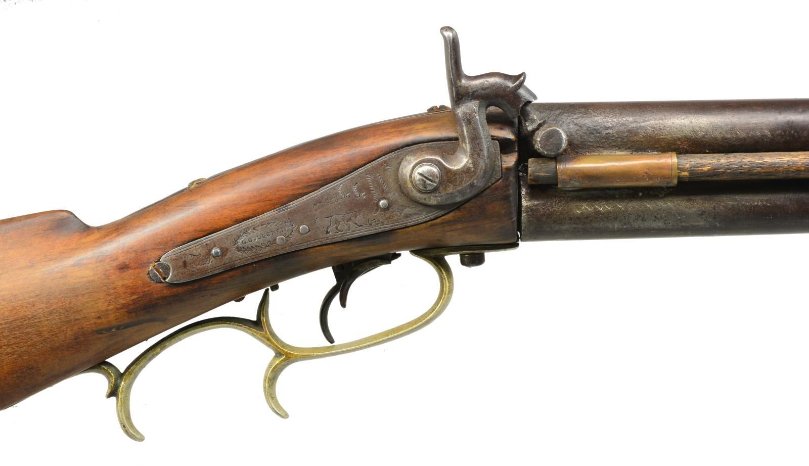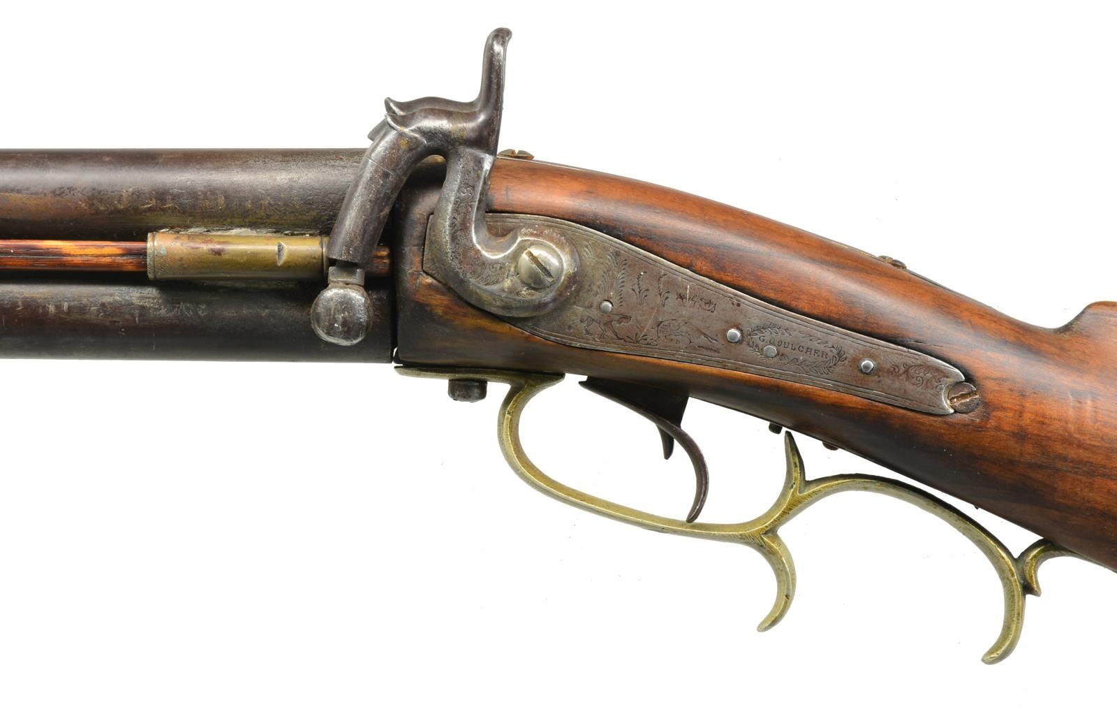 Cal. 34 / 20 Ga. NSN. Bbls. unmarked 35 3/4" rnd. Over bbl. is 34 cal. rifle. Under bbl. is 20 Ga. smooth bore. German silver blade front sight w/ fixed U notch rear sight. Island mounted engraved back action trade locks marked "G GOULCHER". Dbl. triggers. Perch belly walnut stock. German silver fittings consist of rnd. lid patch box, crescent buttplate, toeplate, trigger guard w/ open wing eagle on left side of butt. Both sides of bbls. have 3 German silver or brass ramrod pipes that show evidence of resoldering. Brass tipped hardwood ramrod on right side has dark aged appearance. Left side hardwood ramrod has an artificially stripped finish. Weight: 10 lbs., 15 oz. CONDITION: bbl. finish have faded to a brown patina showing scratches & light pitting that becomes heavier in breech area. Locks show evidence of light cleaning. Refinished stock has a sm. crack right of toe. Right lock will not hold in cocked position. Rifle bbl. retains sound rifling. Smooth bore bbl. shows some very light pitting. (01-18164/DS). ANTIQUE. $500-800.