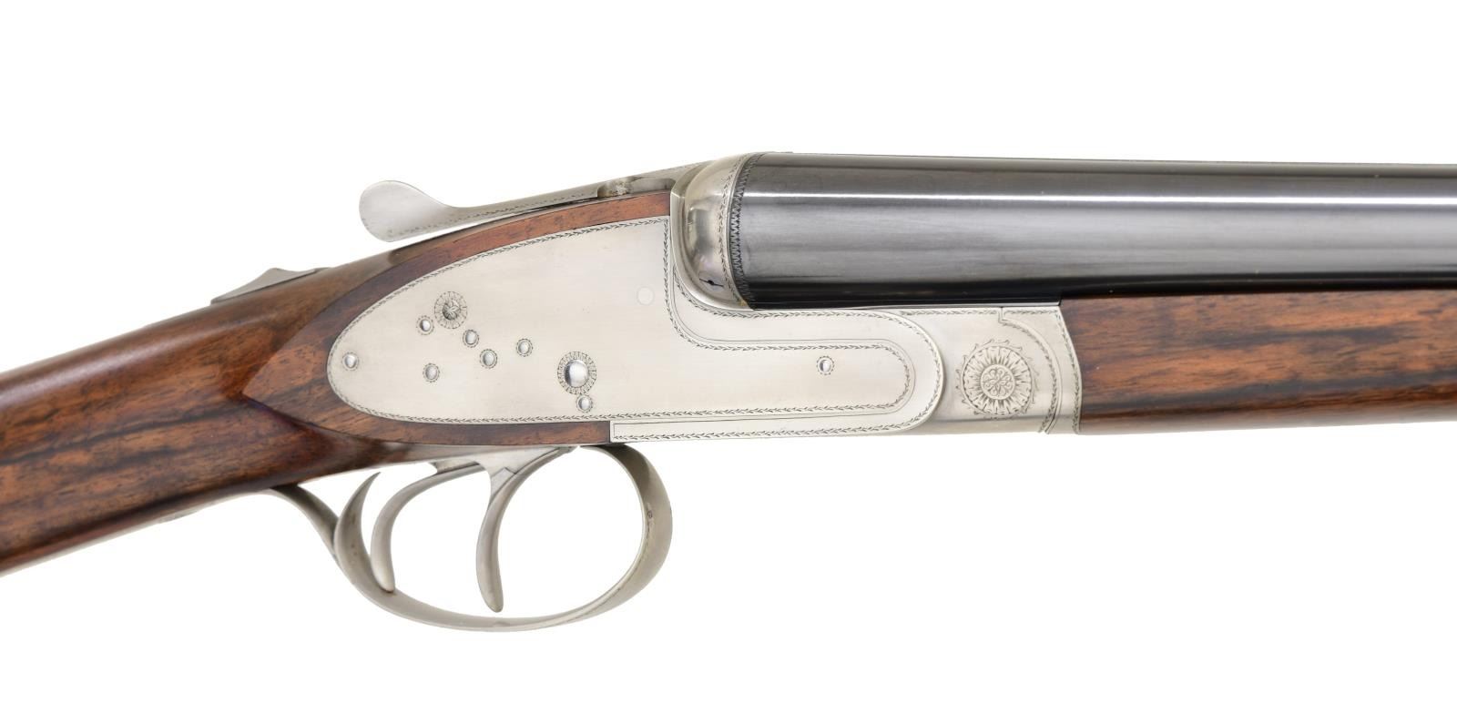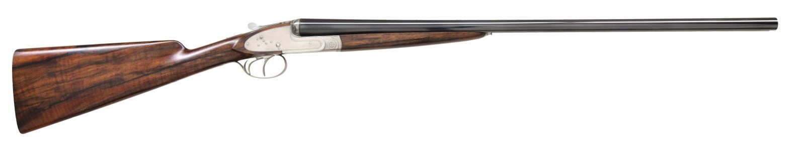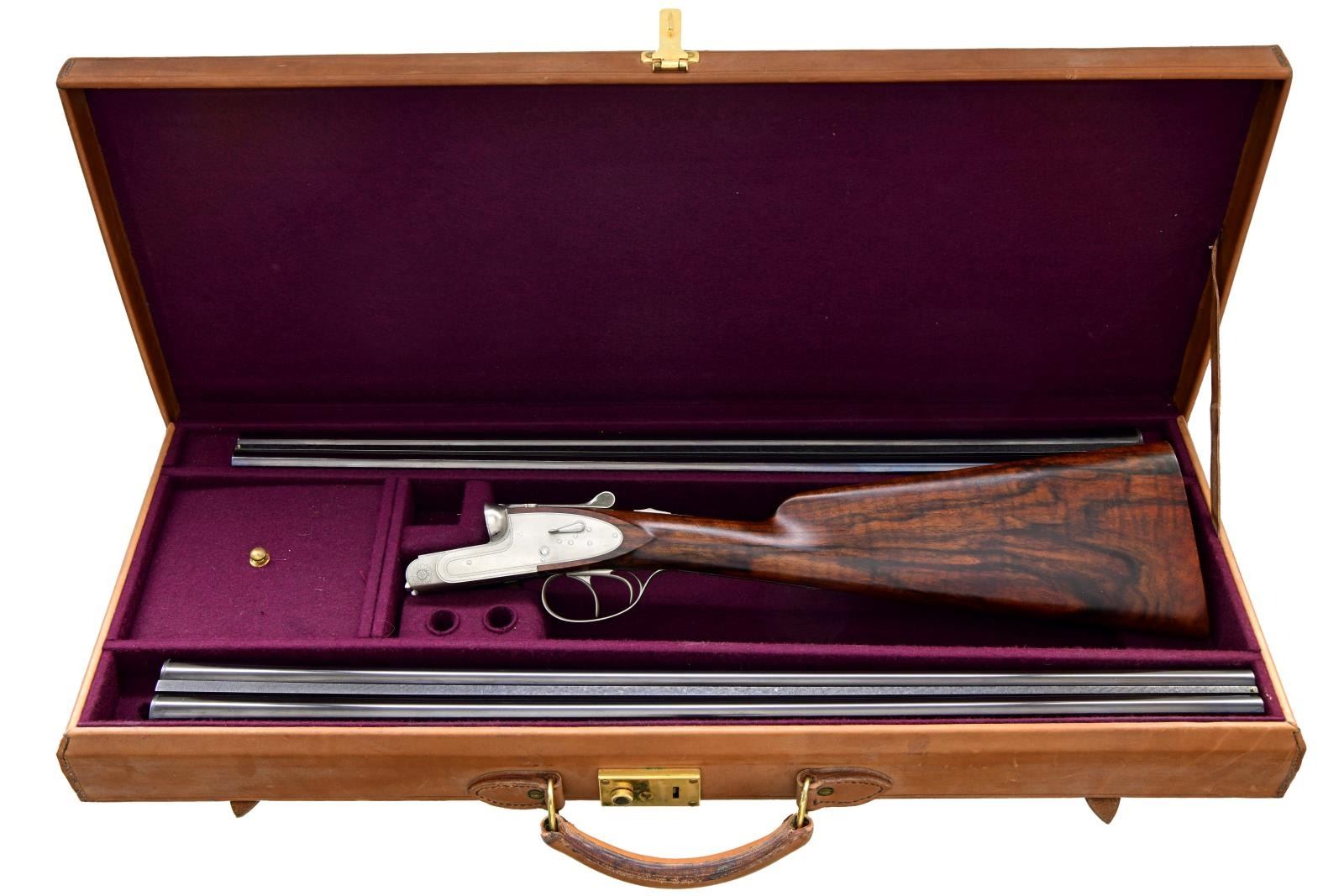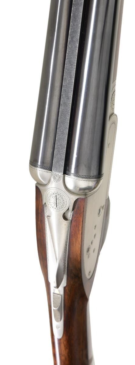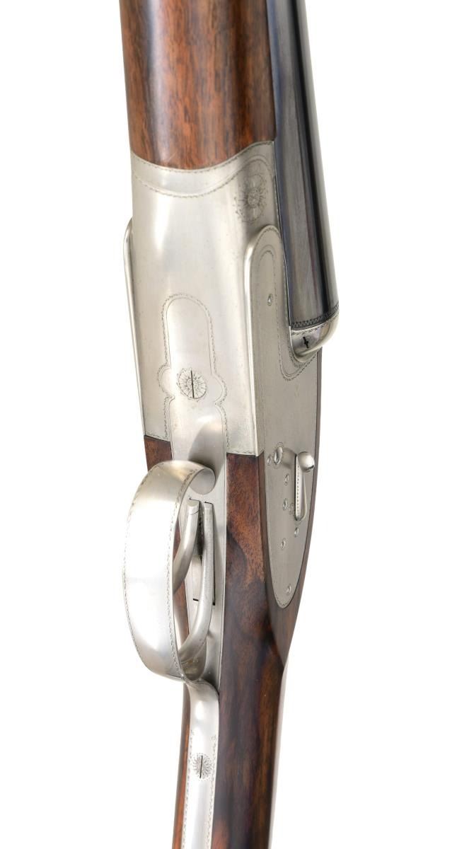 SHOTGUN. Cal. 20 ga. 2 3/4". S# 7364. Georges Granger, successor to renowned gunmaker H. Guichard. Mfg. in St. Etienne, France. Granger Guns are considered equals to the finest guns made anywhere in the world. 7 pin hand detachable top lever sidelock action. Double underlug locking. Bushed firing pins. Selective ejectors. Double triggers, front trigger is hinged. Satin finished action has borderline engraving w/ geometric highlights on hinge pin, top lever & screws. Splinter forearm & straight grip stock of fine European walnut having rich red & brown tones w/ distinctive dark fiddle & streaking. Stock & forearm are uncheckered. LOP: 15 5/16" to a finely checkered butt. DAC: 1 3/8". DAH: 1 7/8". Stock has approx. 3/8" cast off. Bbls. of "Acier Special au Chrome Molybedne" steel have hand-matted sunken ribs. Steel front beads. Bbls. 1: 26". Bore diameter: R .627 L .626. Choke constriction: R .023 L .028. Minimum wall thickness: R .033 L .031. Bbls. 2: 25". Bore diameter: R .627 L .627. Choke constriction: R .007 L .023. Minimum wall thickness: R .034 L .029. WEIGHT: 26" bbls. WEIGHT w/ 26" bbls: 6 lbs, 6.6 oz. UNATTACHED ACCESSORIES: leather covered case w/ purple felt fitted interior. Case lid has initials "J. M. K". Case contains St. Etienne proof certificate, lock removal instructions, packing list dated 1985, 2 LL. Bean snap caps, bore mop & gun cloth. CONDITION: near excellent. Both bbls. retain over 99% blue. Action retains very good finish showing small spots of light tarnish. All bores are bright & near excellent. Wood finish is very good showing small scratches. Action is tight & on face w/ action sitting right of center. Gun appears to have seen little to no use. (24-10/DS). MODERN. $5,000-8,000.