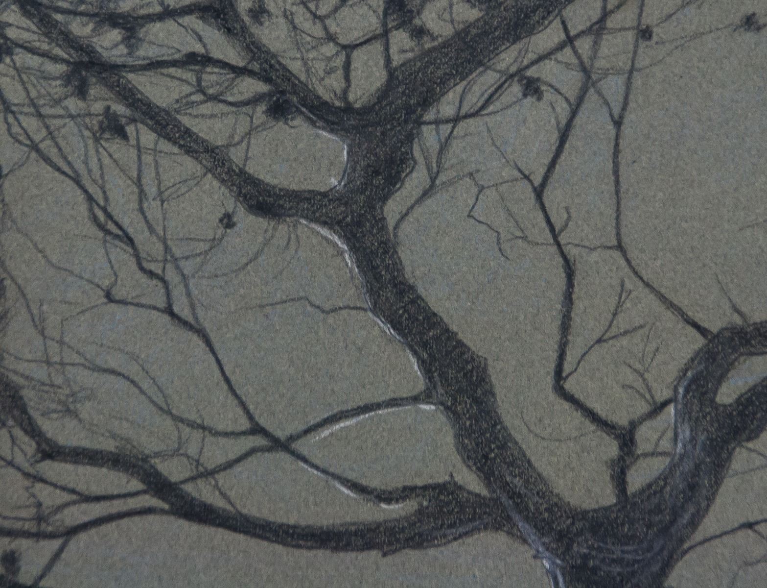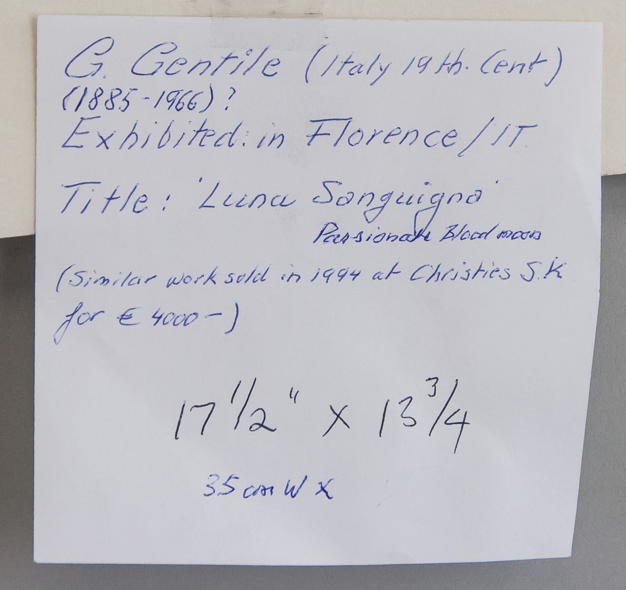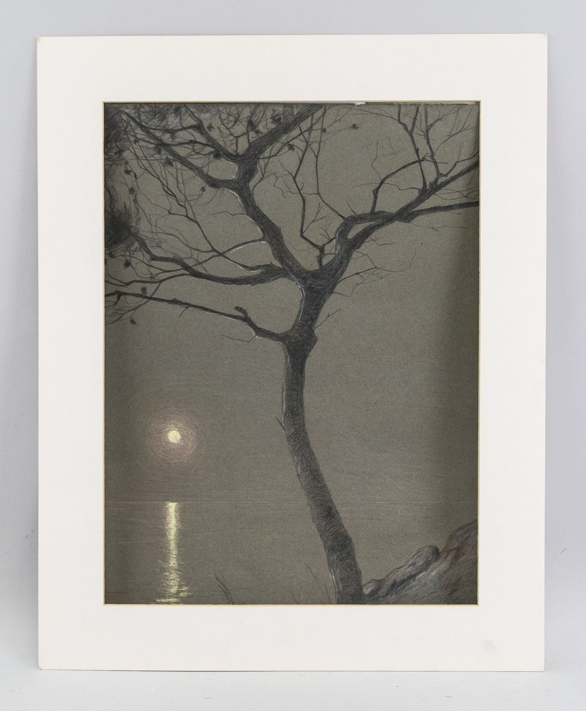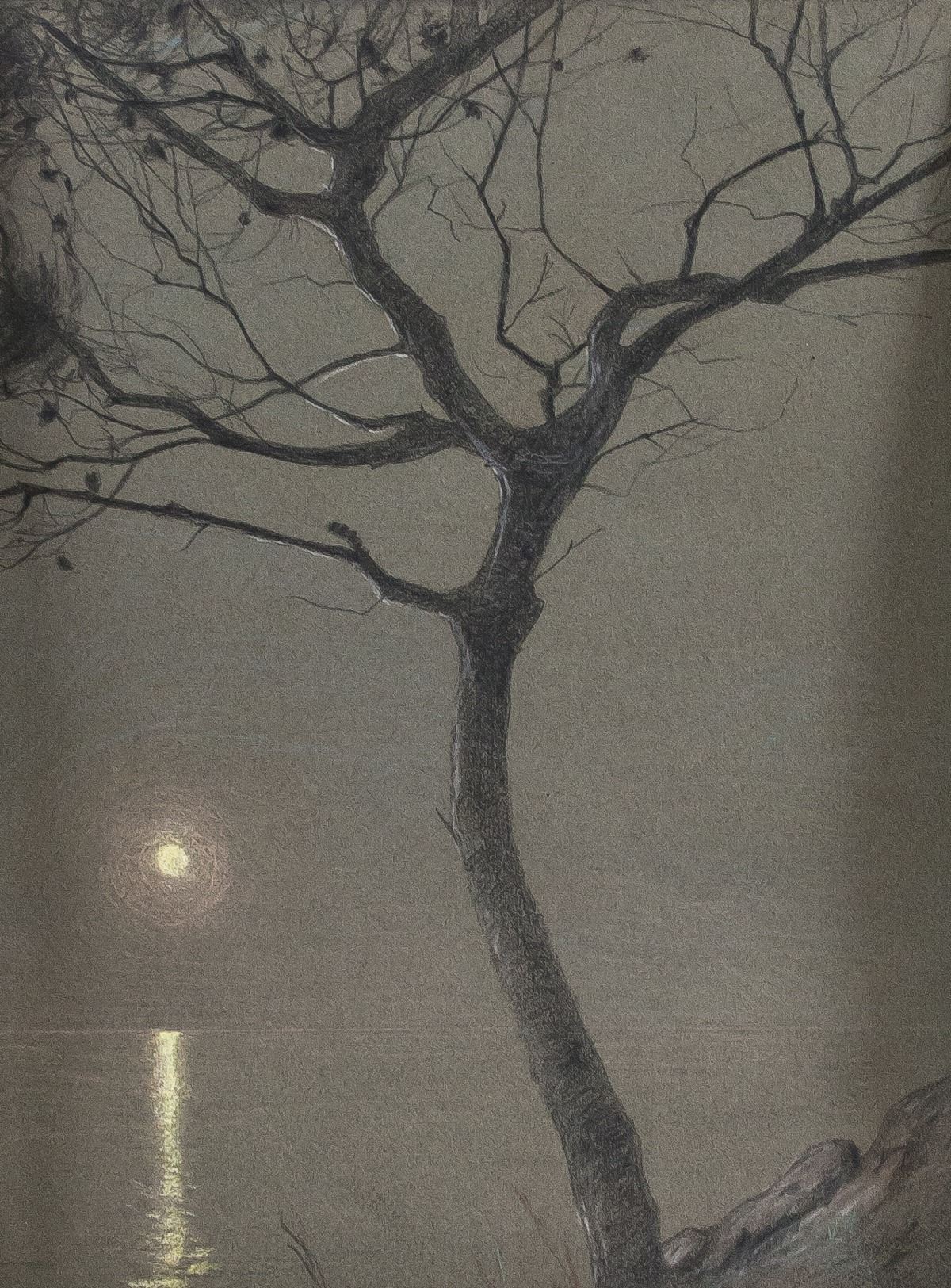 Color pencil on paper. Featuring night scene with tree. Signed G. Gentile on the lower right corner. 45 x 35 cm (17.7 x 13.8 inches). G. Gentile (1885-1966, Italian). Title: Luna Sanguigna. Exhibited in Florence, Italy.