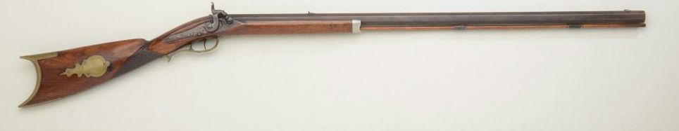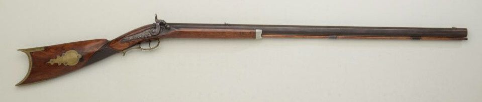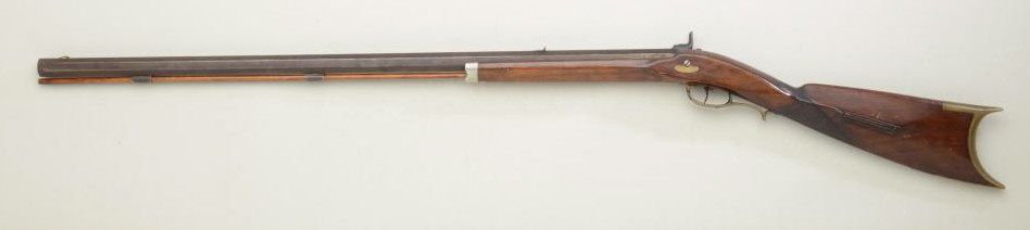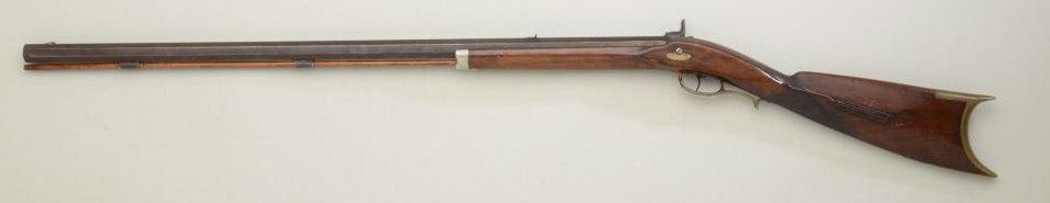 G. Goulcher single trigger, back action lock plains type half stocked rifle, .40 cal., 33” octagon barrel, checkered wood stock with brass patchbox, trigger guard and butt plate; pewter fore end, wood ramrod. This gun isin overall good condition showing a brown patina to barrel with pitting around firing area; good action, dark bore, overall good wood stock; a staple tool of the American family during the mid to late 1800s. From anold collection. Est.: $250-$500.