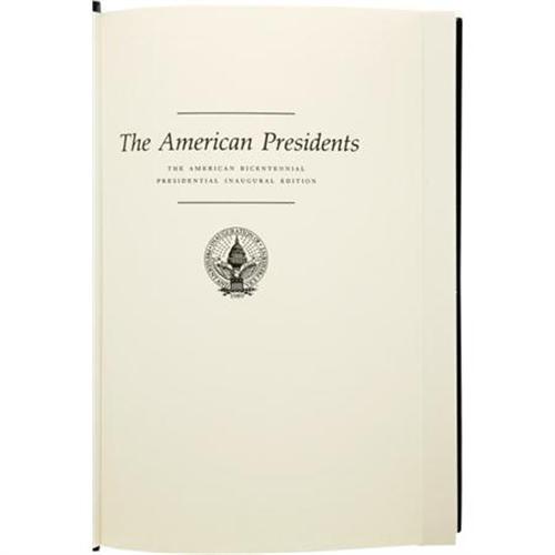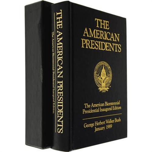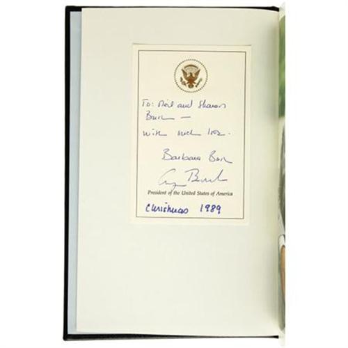 <B>George H. W. Bush and Barbara Bush: Signed Specially Bound and Cased Edition of David C. Whitney's </B></I><B><I>The American Presidents</B></I></B></I> <I>The American Bicentennial Presidential Inaugural Edition</B></I> (New York: Doubleday Book & Music Clubs, Inc., 1989), special limited edition, 562 pages, blue cloth with gilt titles, 8vo (6.25" x 9.5"), housed in a matching blue cloth slipcase. All edges gilt. The book is one of 1,000 numbered copies printed, but is not numbered. Signed "<I>To: Neil and Sharon Bush - with such love. Barbara Bush George Bush Christmas 1989</B></I>" on a bookplate affixed to the front flyleaf. Prepared for the American Bicentennial Presidential Inaugural on January 20, 1989, the senior Bush's first inaugural. A wonderful association copy from within the First Family of 1989. <I>From the personal collection of Sharon Bush and accompanied by a signed Letter of Authenticity from her</B></I>.<BR><BR><BR><b>Shipping:</b> Books & Catalogs (<a target="_blank" href="http://www.heritageauctions.com/common/shipping.php">view shipping information</a>)