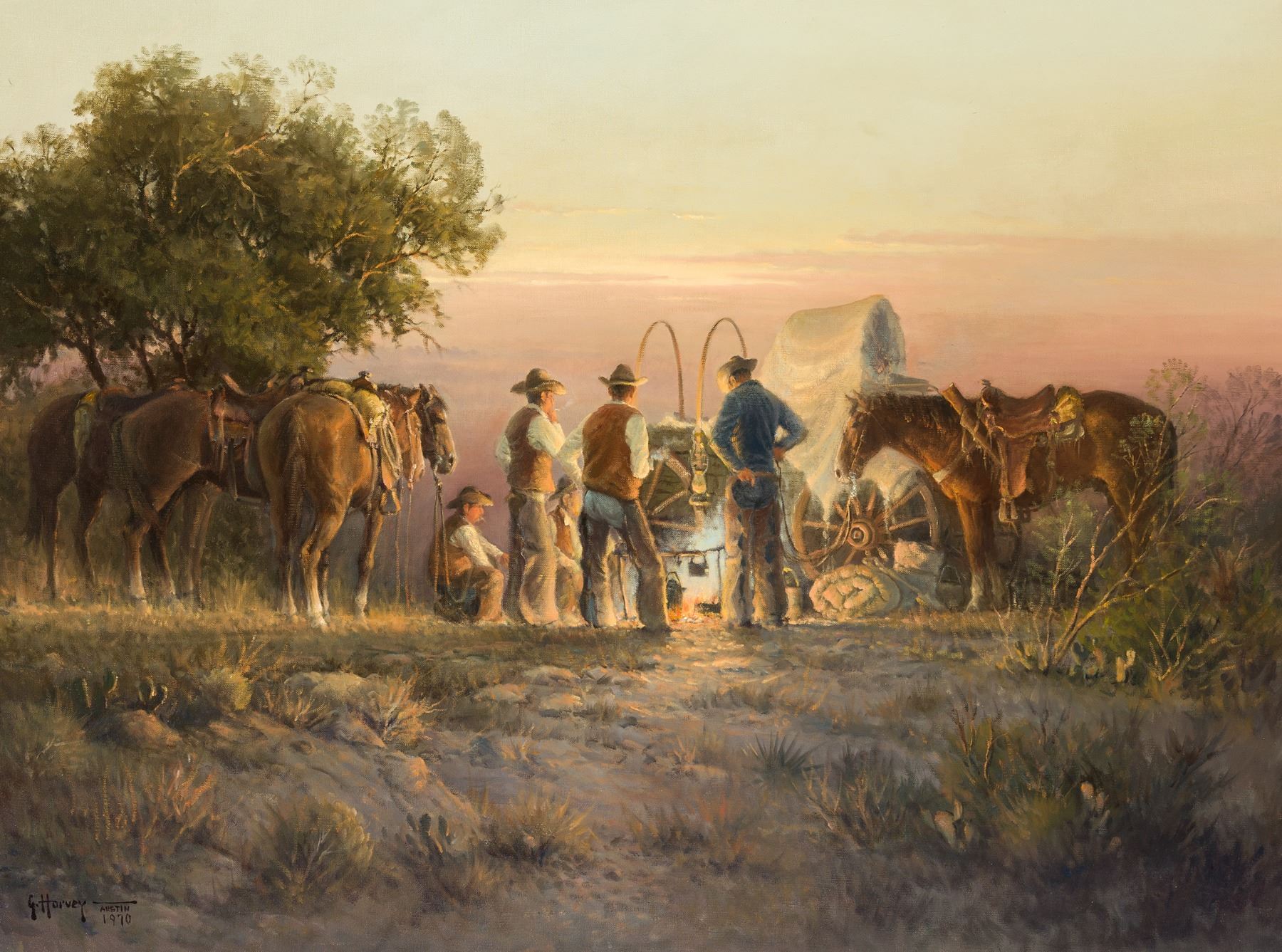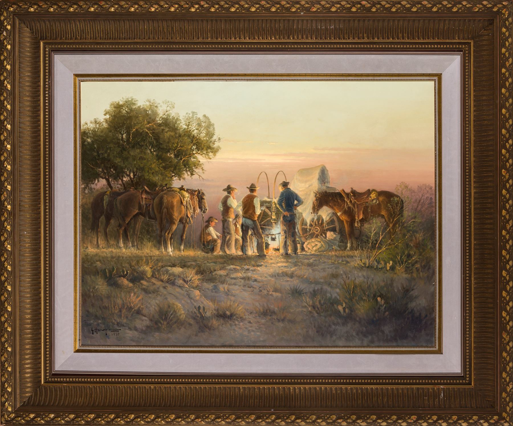 Condition details: This painting is in excellent condition. Close inspection with the unaided eye and under UV light reveals nothing of issue and no signs of any restoration. The work is framed in a wide ornate gold scoop with a gray suede fabric liner and a gold beaded inner liner. The frame is in very good condition with little wear. Verso: inscribed on stretcher bars: WEB 0-132 “Spinin Yarns” (sic) A701.