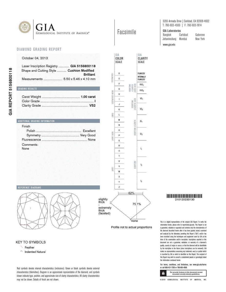 1.00ct Cushion Diamond VS2 clairty I color 5.50x5.46x4.10mm with certificate