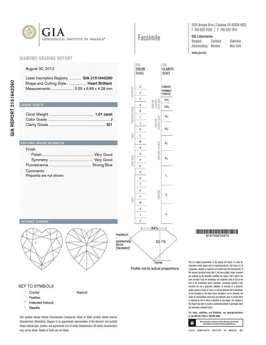 1.01ct Heart Shape Diamond SI1 clairty, J color , 5.5x6.89x4.28mm with certificate