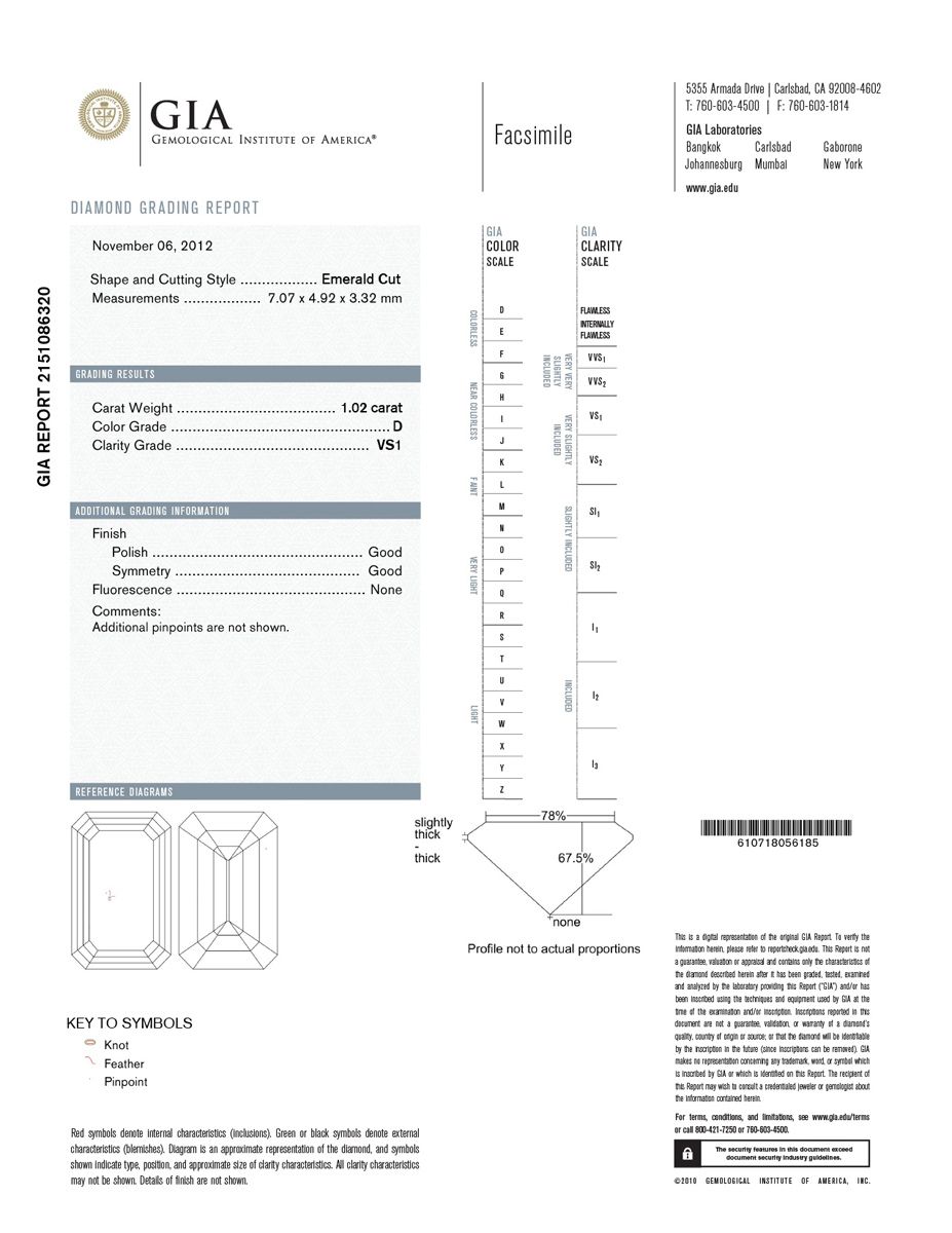 1.02ct Emerald Cut Diamond, VS1 clairty, D color, 7.07x4.92x3.32mm with cert