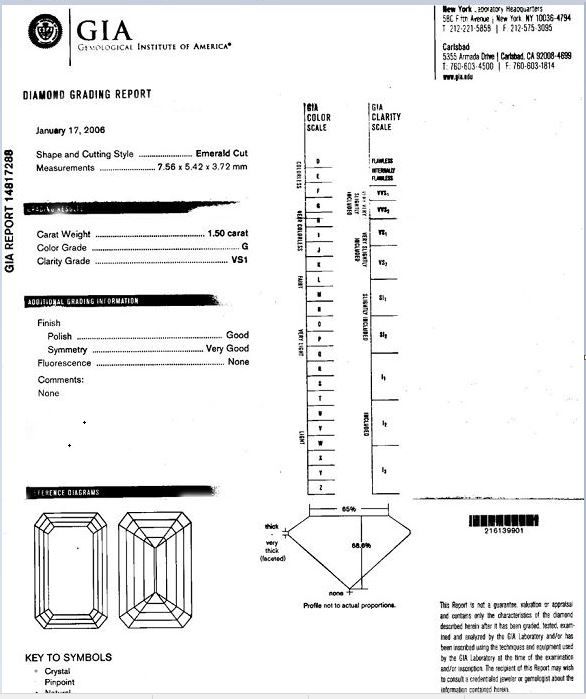 1.50ct Emerald Cut Diamond, VS1 clairty, G color, 7.56x5.42x3.72mm with certificate