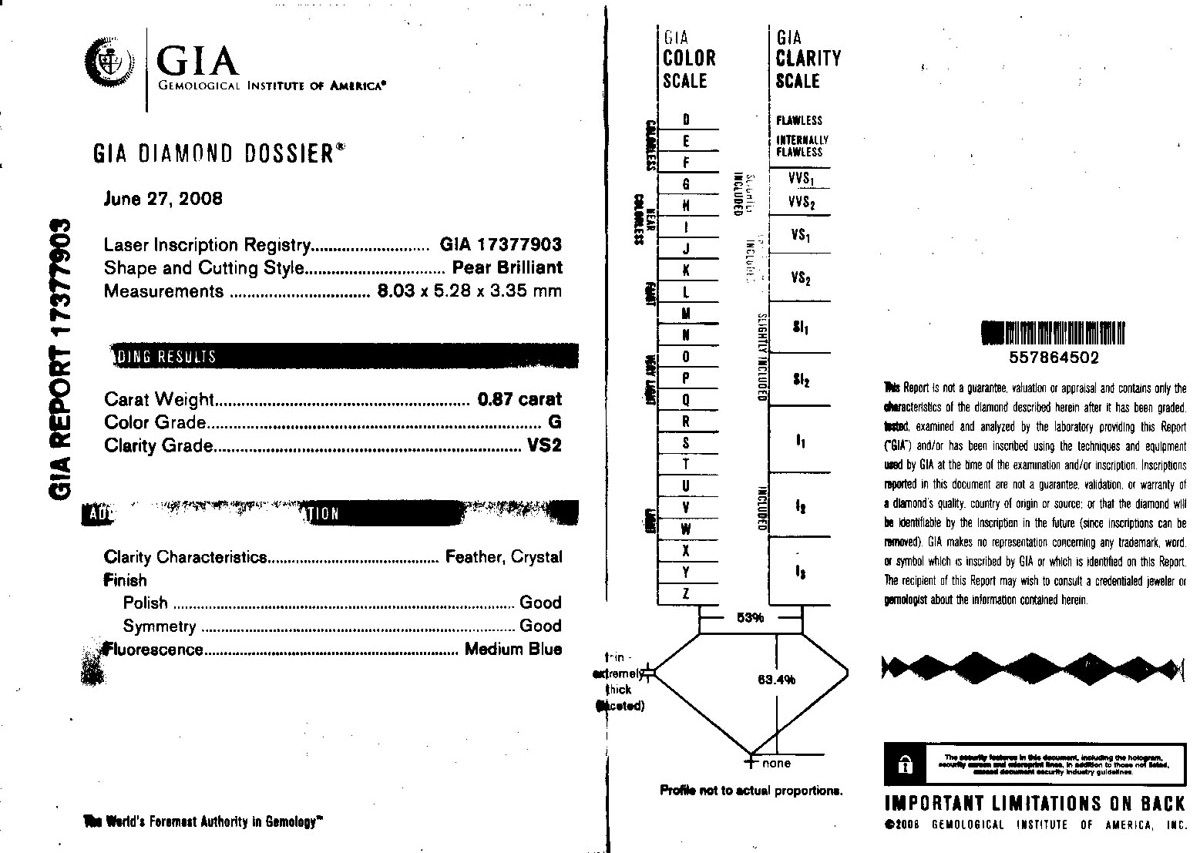 .87ct Pear Shape Diamond, VS2 clairty, G color, 8.03x5.28x3.35mm with cetificate