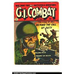 G.I. Combat #1 (Quality, 1952) Condition: GD/VG. Reed Crandall did an outstanding job on the cover of this important seminal war issue. If you look closely, you can see a bullet passing through the top of one of the soldier's heads. This GD/VG copy has several names written in pen on the back cover. The page quality is excellent...this book is not brittle in any way. Read this gem and find out why the name "Quality Comics" was not a misnomer for this company. Overstreet 2002 GD 2.0 value = $64; FN 6.0 value = $192. Important notice: We expect to be auctioning lots at the rate of 200-250 per hour. Sometimes eBay Premier live bid software cannot keep up with that pace, so we strongly recommend that you place a realistic proxy bid now as insurance to avoid disappointment. Also please note that all Heritage/CAA lots purchased through eBay Premier carry a 20% Buyer's Premium. Please make sure you read the Terms and Conditions.