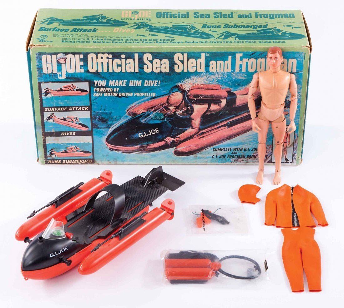 G.I. JOE SEA SLED AND FROGMAN SET - (1960’s era) Official Sea Sled and frogman, in original box. 20 in. long, one-man submersible sled can be used to dive or surface in water. Powered by “safe motor driven propeller”, this Sea Sled comes with one G.I. Joe Frogman figure.