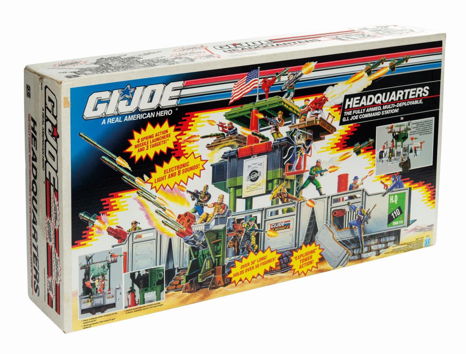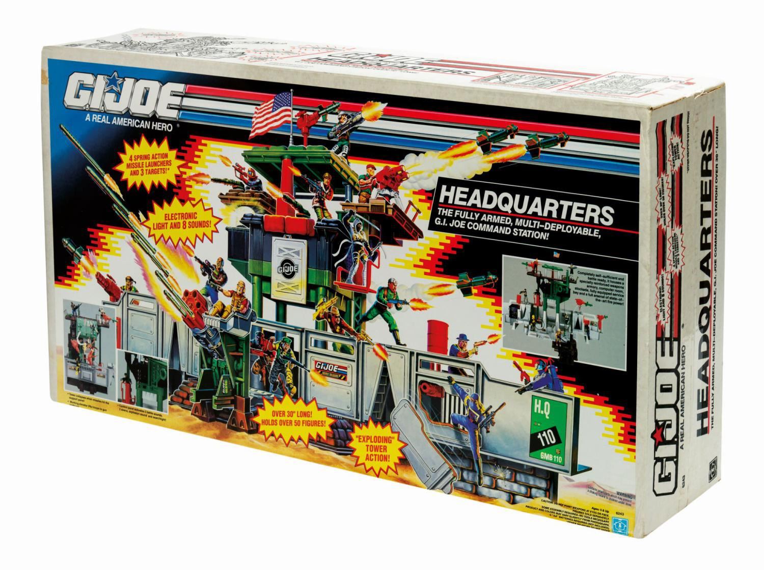 (Hasbro, 1992) A vintage G.I. Joe Headquarters playset manufactured by Hasbro. The assembled playset measures over 30" long. Never opened, all items are factory tape-sealed inside the original cardboard box packaging. Measuring 16.25"x30.5" and 6.75" deep, the box is in very good condition with minor corner bumping, handling, and small spot surface loss at upper right face.