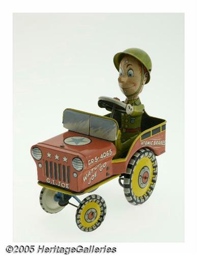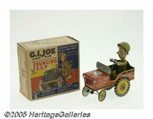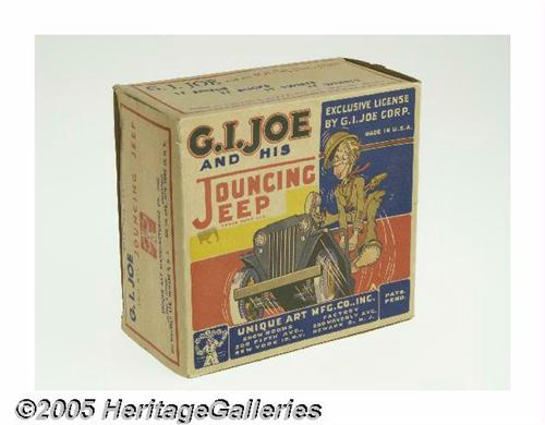 <B>G.I. Joe Jouncing Jeep Toy with Box (Unique Art Manufacturing Co., 1940s).</B></I> The G.I. Joe character first appeared immediately after World War II, but was a short-lived toy -- nothing like the doll produced almost twenty-five years later. The first incarnation was a smiling, silly-looking characterization of a soldier in a jeep. Manufactured by Unique Art, this wind-up lithographed tin toy features the original Joe comic military figure seated in a multi-colored jeep. The clockwork action causes the G. I. to bounce up and down as it moves forward. This toy is in good working order. The 7" x 8" Jeep is in immaculate condition, with very little wear. The paint is still glossy, and the bodies of Joe and the Jeep are in fantastic shape. The original box has little to no wear and is completely intact. The label colors still glow. A sterling example of this toy with its original box. <I>From the Larry Jacobs Collection.</B></I>
