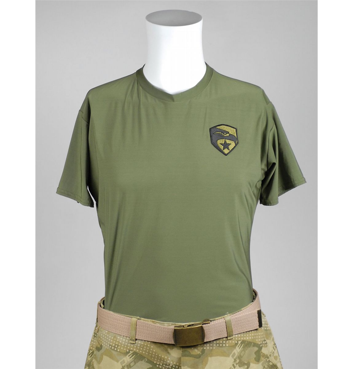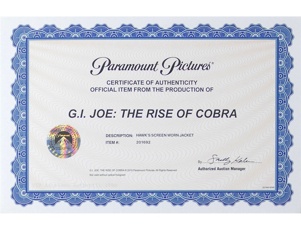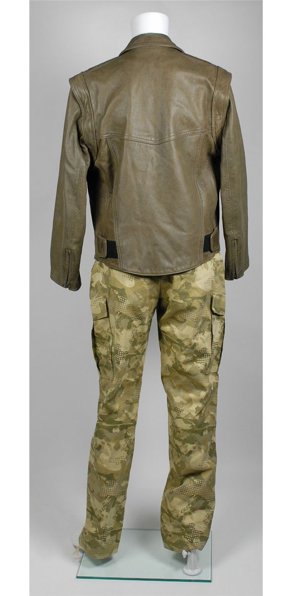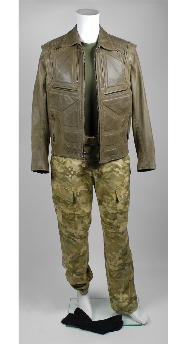 Screen-worn costume worn by Dennis Quaid as ‘The Hawk’ General Clayton M. Abernathy in the film G. I. Joe: The Rise of Cobra. Costume consists of: a light green leather jacket, with removable sleeves, and a Mirojnick maker’s tag sewn into the collar, along with a smaller tag embroidered “DQ,” sewn into the bottom of the lining; a pair of green camouflage pants by Mirojnick; a green XXL Under Armour t-shirt with a military patch sewn over the left breast; a pair of black socks, and an Army belt labeled in black felt tip, “Hawk DQ.” Accompanied by a certificate of authenticity from Paramount Pictures for the jacket and a letter of provenance, which reads, in part: “This costume from the movie GI Joe: The Rise of Cobra consists of jacket, belt, pants and t-shirt all worn by Dennis Quaid as General Abernathy…This is the Hero #1 costume worn by the character and to my knowledge the only copy made for production…The outfit was made by Ellen Mirojnick.” In fine condition.
