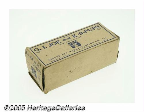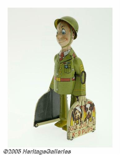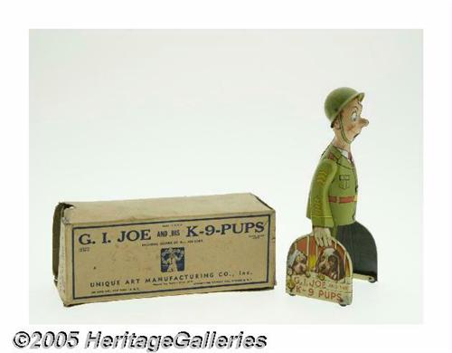 <B>G.I. Joe and the K-9 Pups Wind-Up Walker Toy with Box (Unique Art Manufacturing Co., 1940s).</B></I> The original G.I. Joe was far removed from the well toned action hero he later became. To get an idea of how much, check out this tin litho manufactured by the Unique Art Manufacturing Company. G.I. Joe and the K-9 Pups is a 9" wind up toy, with a more comical version of Joe holding two cages, each carrying two cute puppies. The toy is in Very Good to Excellent condition. A little minor wear in a few spots on an otherwise glossy little number. The color is bright and the body has no dents or scratches. The box measures 3.5" x 3.5" x 9" with some slight soiling and a tear at one of the flap edges, a few flaps are missing; otherwise in Excellent condition. <I>From the Larry Jacobs Collection.</B></I>