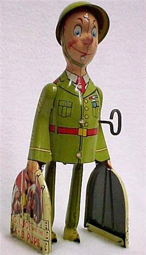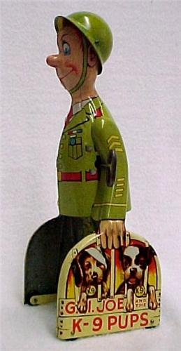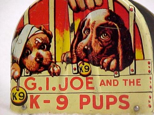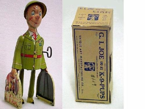 G.I. Joe and the K-9 Pups with original box; tin wind-up toy; working condition; Unique Art Mfg. Co. Inc; 9" high (no visible defects)