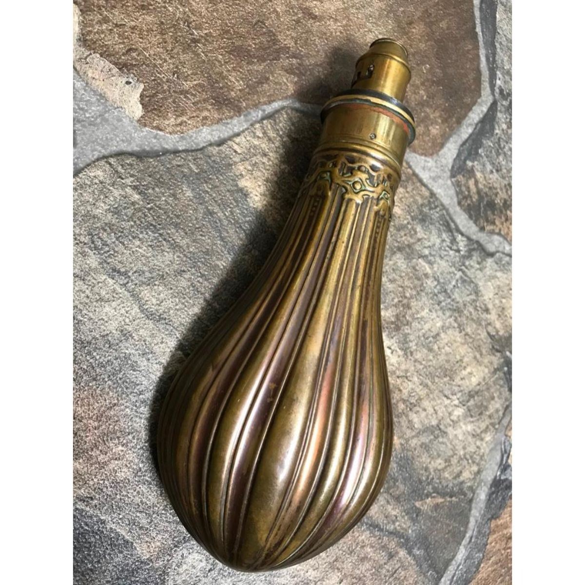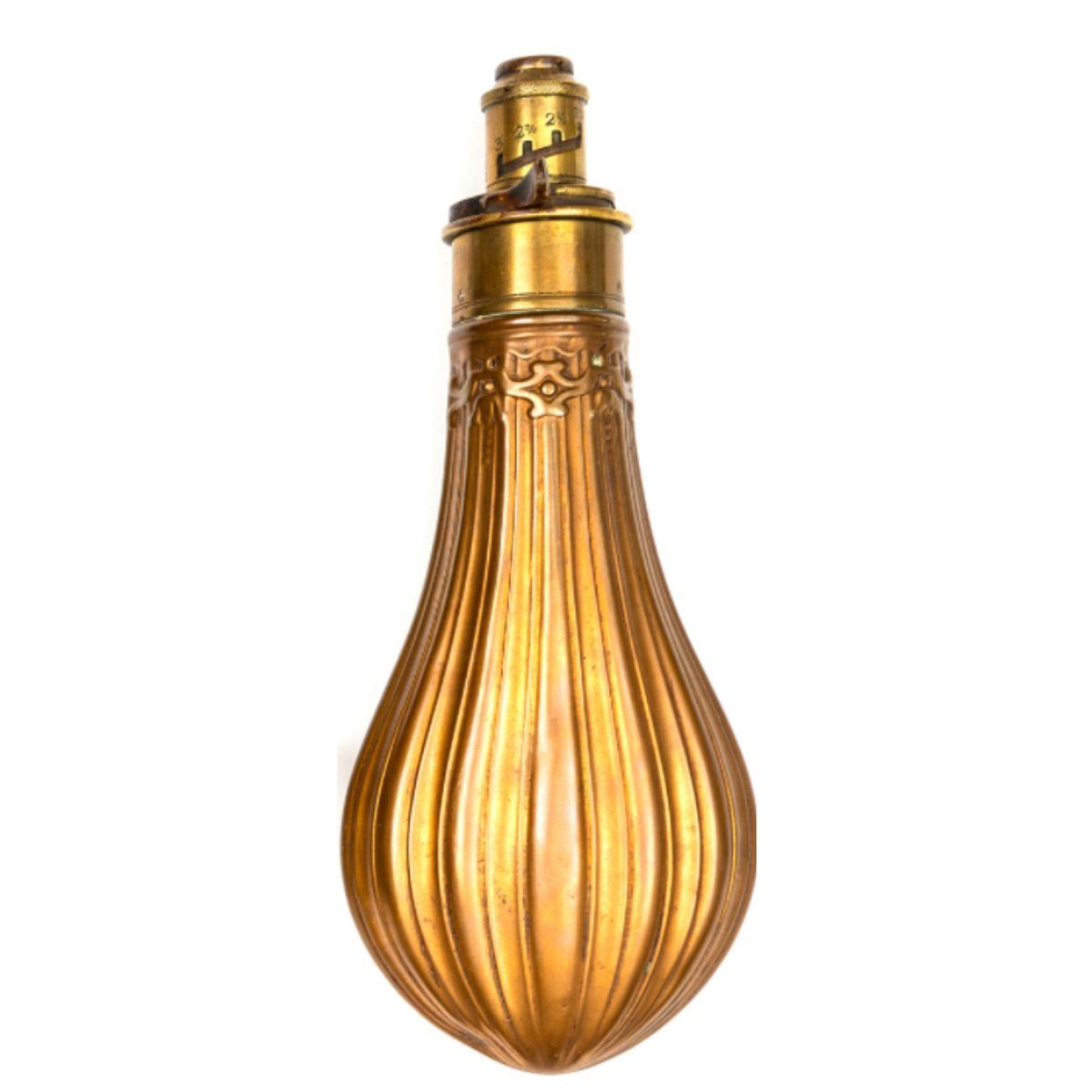 Copper gun size powder flask, fluted with brass top, marked “G & J. W. Hawksley, Sheffieldâ€, graduated charger 2¼-3 “Dramsâ€, 8¼†overall. Good condition. 8 1/2" L X 3 1/2" W.