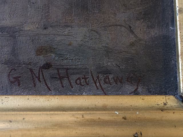 This beautifully framed Oil on Canvas "Breakers Row, Palm Beach" signed: G.M. Hathaway. George Milton Hathaway was born in Boston in 1852. His output was confined to the period from 1889 until 1903, the year of his death in Portland. His work is housed at the Kendall Whaling Museum, Mariners Museum, Peabody Museum and Portland Art Museum. (Source:Who's Who in American Art.) This oil on canvas is in vintage beautiful gilted frame. Measures approx. 15" wide x 11" tall (frame size).