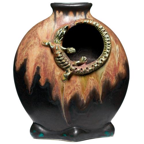 G. Mettheny vase, flattened form with an opening at side surrounded by a carved lizard, signed, 7.5"h