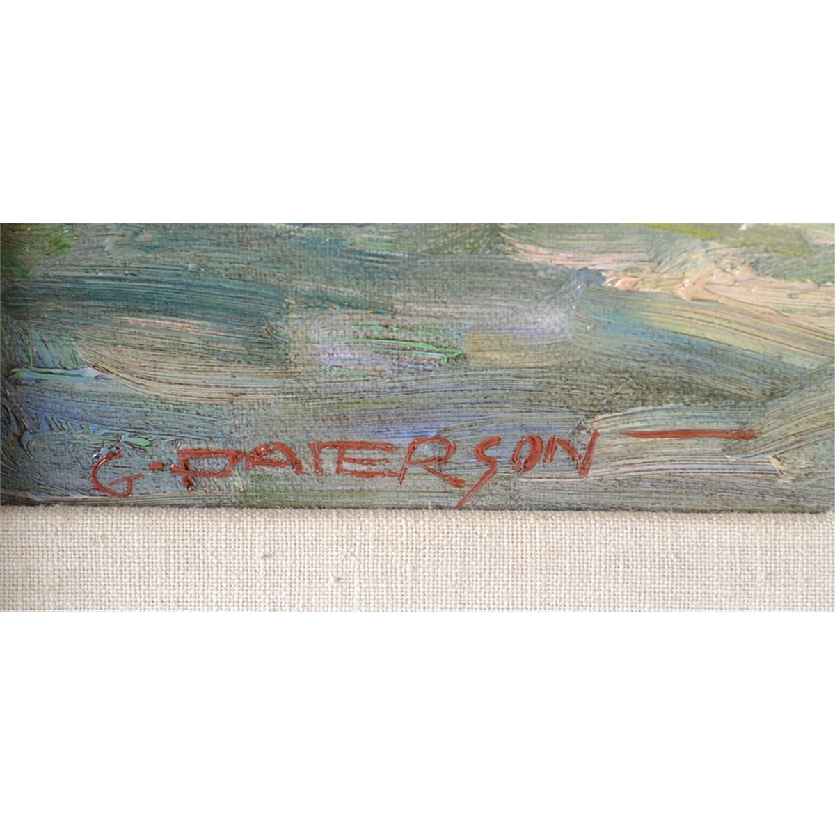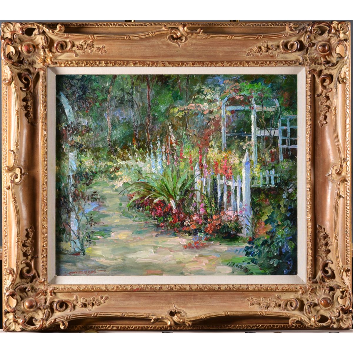 Painted to depict lush gardens with trellis, fence and path. Signed G. Paterson in LL, probably Grace Patterson Pennsylvania (mid 20th century). Framed in a gold carved wood frame with linen mat. 19.5" H x 23.25" W, sight, 29.75" H x 33.75" W, framed. Circa 20th century. Private collection Metamora, MI.