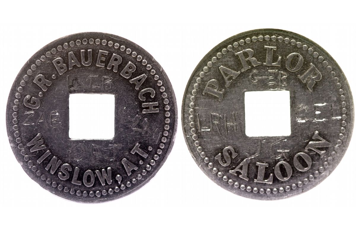 c1908 Round aluminum, 24mm obv.: "Parlor Saloon" rev.: "G.R. Bauerbach/ Winslow, A.T." Slabbed by NCS and certified Genuine. Serial # 5207725-097. Square hole in center. Each face of the token is marked with hand-scratched initials: GEB/ LRH/ CEL/ JG // LTB/ ZAB/ S&/ OFJ. An interesting territorial piece. - HKA#64501
