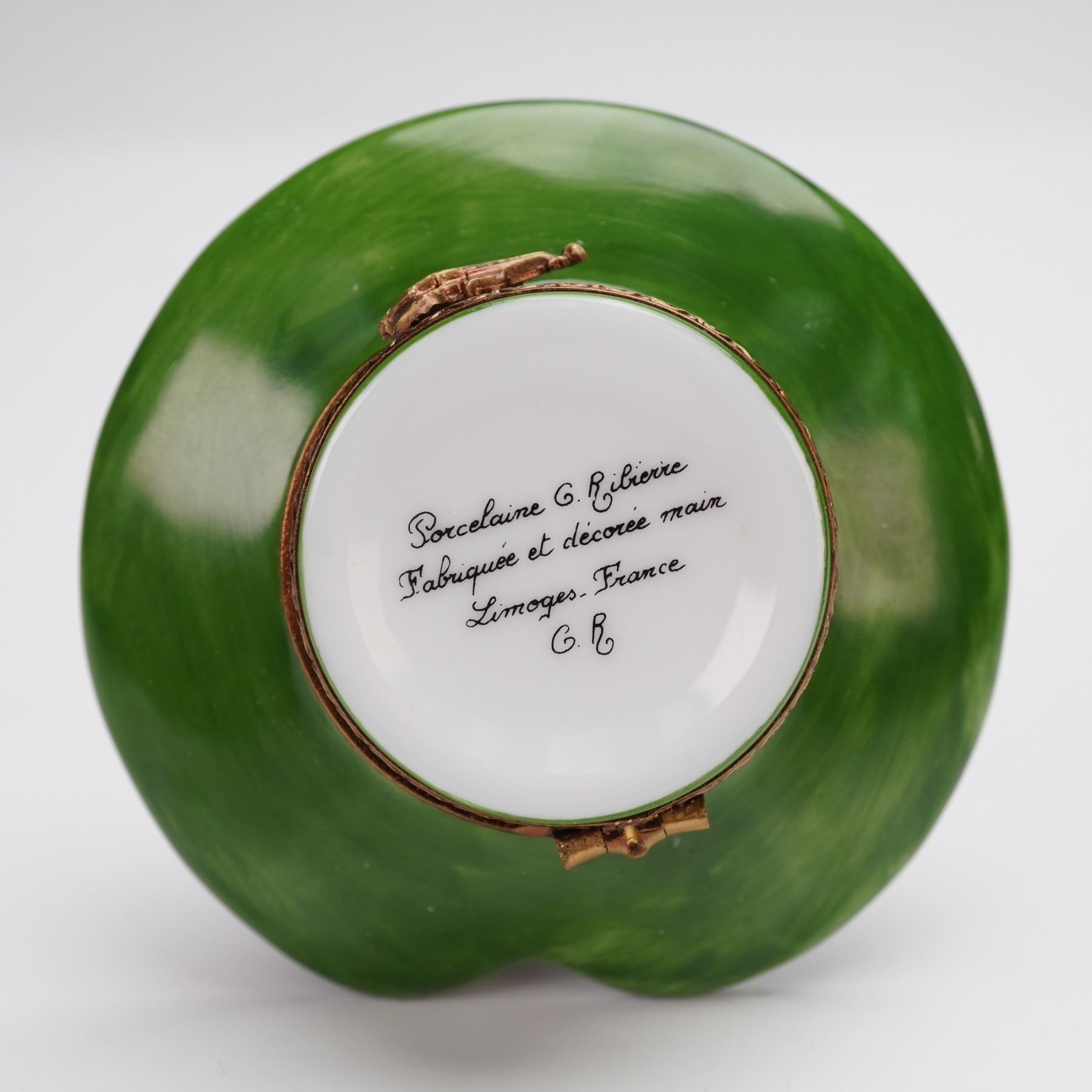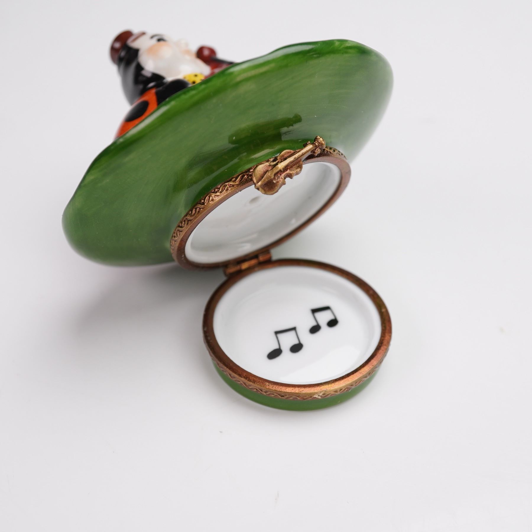 This charming Limoges porcelain treasure box, created by G. Ribierre, features a playful hand-painted ladybug seated on a vibrant green leaf, joyfully playing a musical instrument. The intricate design is enhanced by the bright colors and fine detailing. Inside, musical notes are painted on the base, adding to the whimsical theme. The backstamp reads Porcelaine G. Ribierre and Limoges, France, signifying its authentic craftsmanship. The piece is secured with an elegant gold-tone clasp, combining artistry and function in a beautifully crafted collectible.