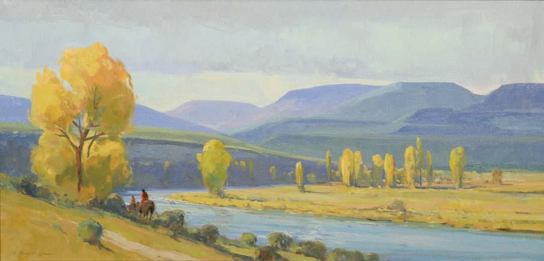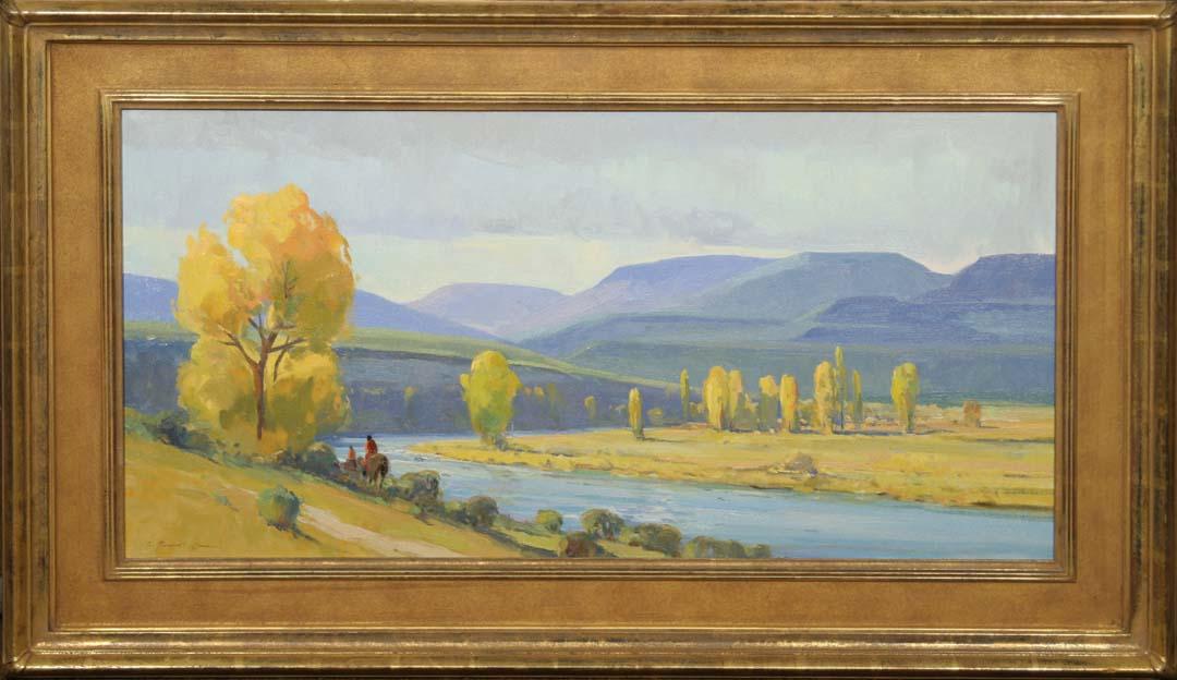 G. Russell Case (b.1966). Green River Camp At Brown's Park, 2007. 18" x 36" oil on canvas. Signed lower left. (est $5,000-7,000). For condition reports please visit: www.auctioninsantafe.com/cr2011.pdf
