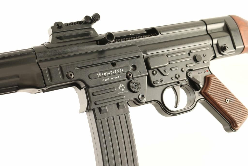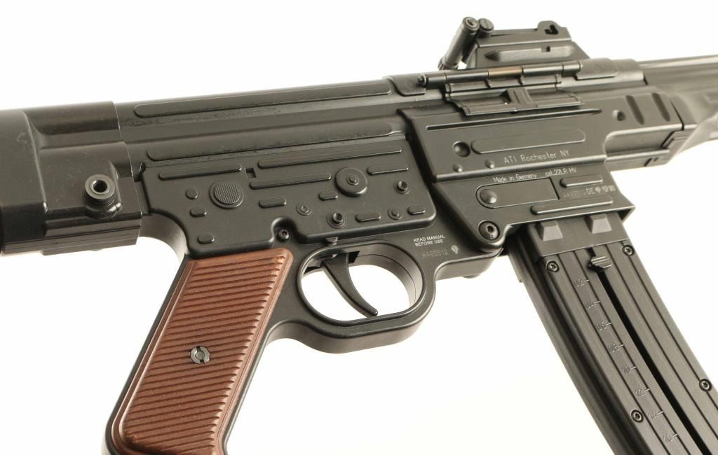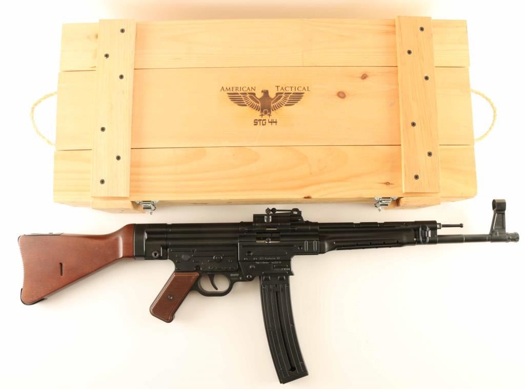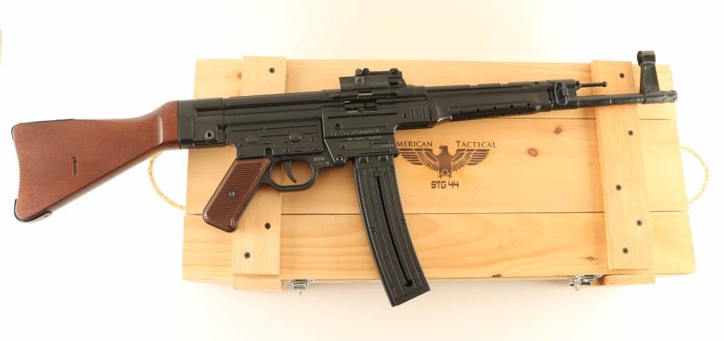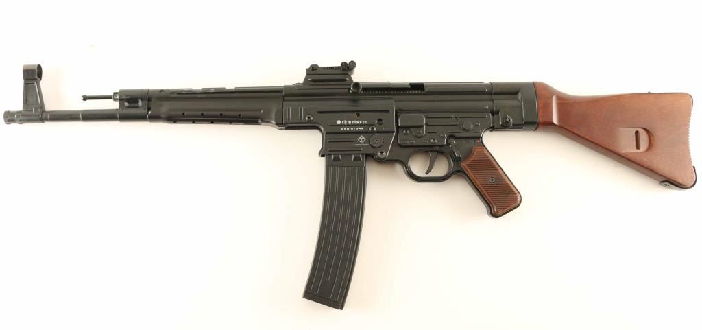 'Schmeisser' German made semi-automatic modern sporting rifle modeled after the iconic STG-44, manufactured circa 2012. Imported and marketed by ATI of Rochester, N.Y. with import marks on the right side of the receiver. Features a black finish, 16.25" barrel, raised & hooded blade front sight, tangent rear sight graduated to 1,000 meters, smooth trigger, manual selector on the left side of the grip frame, dust cover, stacking rod, cylindrical charging handle with flared tip, push button magazine release, factory 25 round magazine, ventilated metal handguard, grooved brown synthetic pistol grip and smooth wood shoulder stock with trapdoor & serrated bare butt. Includes a hand made WWII style pine crate with documents, cleaning brush, lubricant and lock. Rifle retains approximately 99% original finish showing little wear. Action is smooth, the bore is excellent and the wood stock is fine. Condition is NRA Excellent. ***Modern Firearm***
