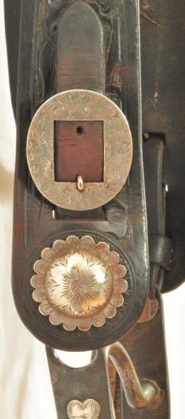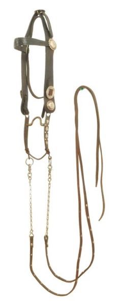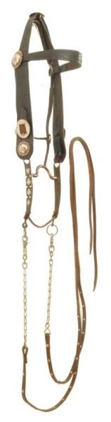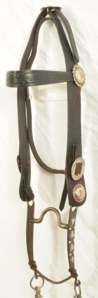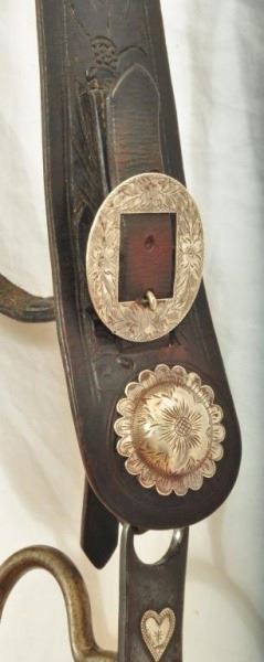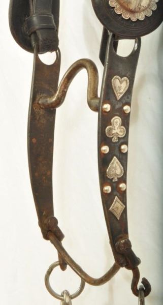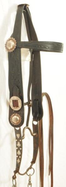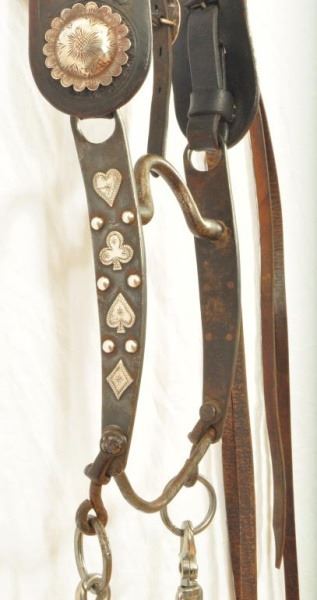 Fancy hand carved head stall with sterling silver buckle and conchos marked GSG. Comes with silver mounted card suit bit, prison made, Chains and reins with silver diamonds.