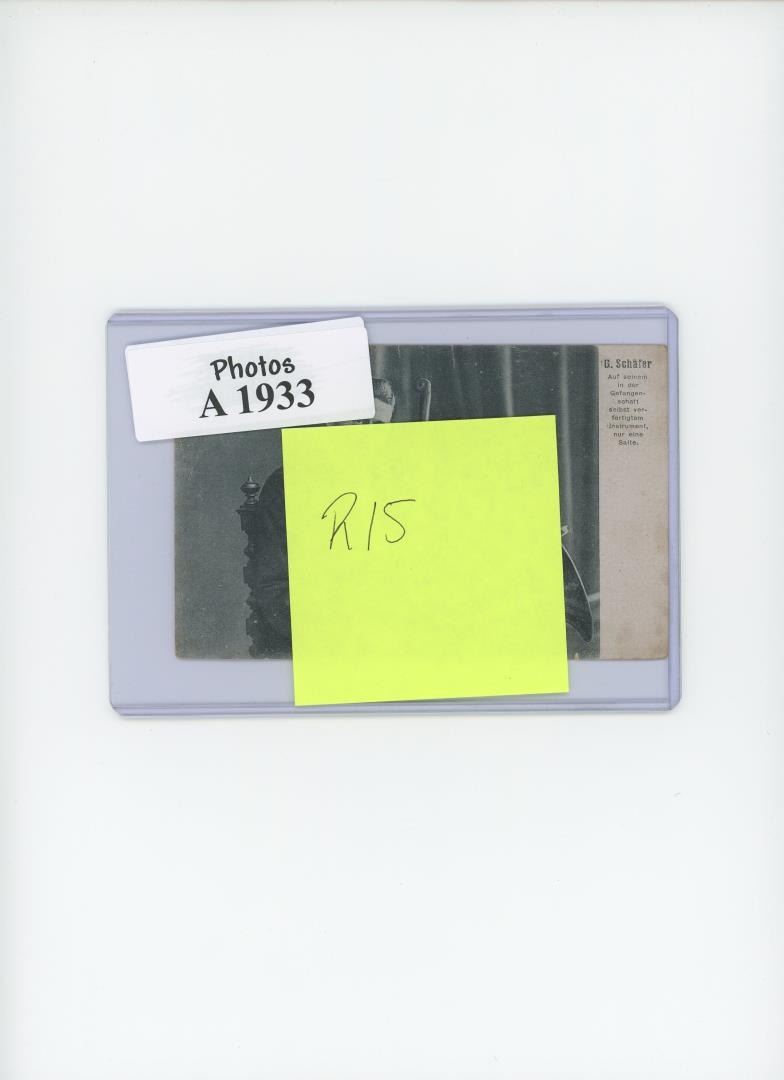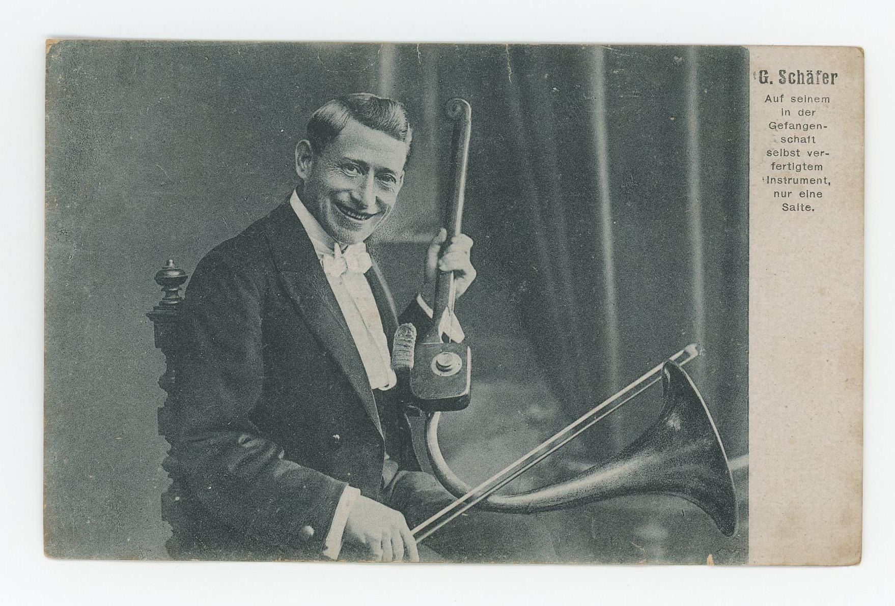 Text translates to G. Schafer On his instrument, which he made himself in captivity, only one salto.