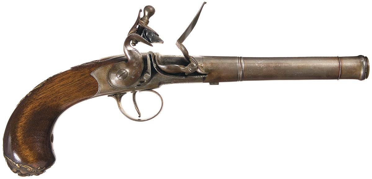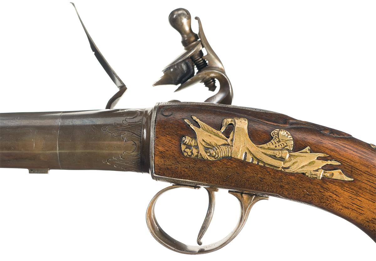 Unmarked barrel with cannon muzzle, a set of decorative bands and ribs, and a wrench lug on the underside of the chamber. Scroll engraved frame, tang and hammer, with border decoration of the frame, filed designs on the uniquely shaped frizzen spring, and "G. Suiter" signed on the underside next to a set of "crown/ V" and "crown/ GP" London proofs. Smooth one piece bag shaped grip, with raised carving around the tang, a brass stand of flags and arms on the left side, brass inscription plate on the wrist and a grotesque face on the pommel cap.