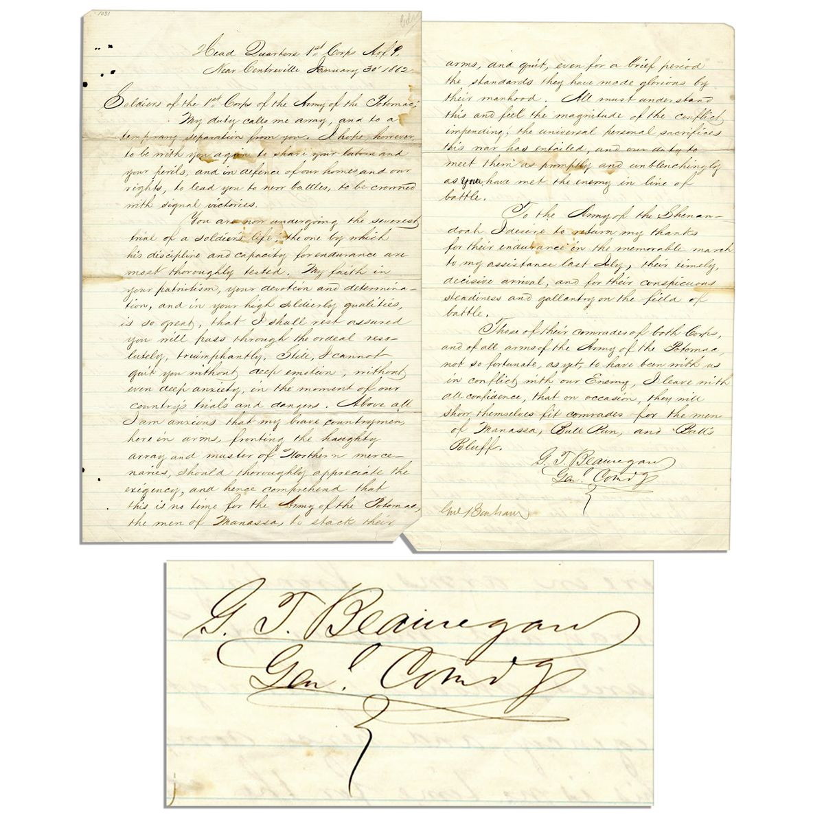Civil War Confederate General G.T. Beauregard autograph manuscript signed, leaving his Army of the Potomac, the first established Army of the Confederacy whom Beauregard -- the Confederacy's first Brigadier General -- led at First Bull Run. Having been transferred to the Army of the Tennessee, Beauregard writes from ''Head Quarters 1st Corps A of P Near Centreville'' on 30 January 1862: ''...You are now undergoing the severest trial of a soldier's life...My faith in your patriotism, your devotion and determination, and in your high soldierly qualities is so great, that I shall rest assured you will pass through the ordeal resolutely...Still, I cannot quit you without...deep anxiety, in the moment of our country's trials and dangers...[T]his is no time for the army of the Potomac - the men of Manassas - to stack their arms and quit...To the army of Shenandoah, I desire to return my thanks for their assistance, last July, their timely, decisive arrival...Those...not so fortunate as yet to have been with us in conflict with our enemy, I leave with all confidence that on occasion they will show themselves fit comrades for the men of Manassas, Bull Run, and Ball's Bluff...'' G.T. Beauregard / Gen'l Com'dg''. 2pp. measures 8'' x 12.5''. Foxing, toning minor separation at folds and paper loss to corners. Very good condition.