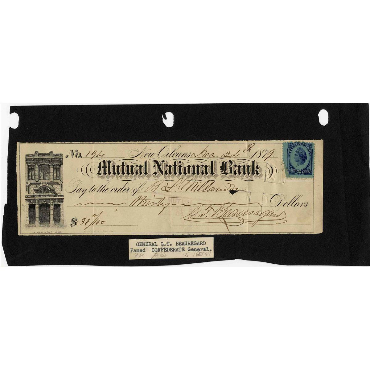 Check signed by Confederate Civil War General G.T. Beauregard. Dated 20 December 1879, handwritten check by Beauregard for $30 was made payable to a B.L. Millardon. Drawn on the New Orleans Mutual National Bank, check measures 8.25'' x 2.5''. Closed incisions to right portion of check, touching the top part of signature. Also mounted to piece of black paper, else very good condition.