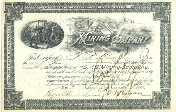 1891, New York. Stock certificate for 10 shares. Black. Vignette of miners at work at top left. Pen cancelled. Very fine.